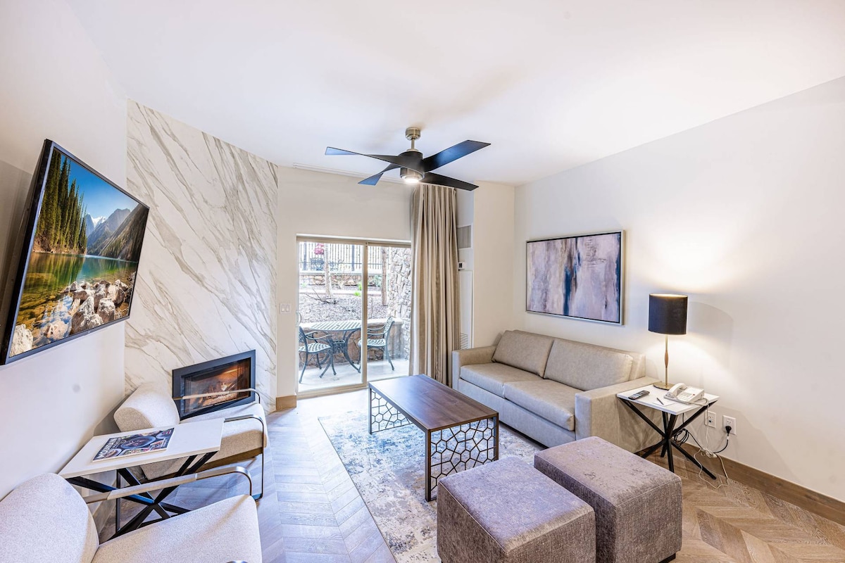 The perfect King hotel room base of the mountain! Kitchenette, fireplace, 58" TV, jetted tub with bath salts and bubbles, luxury linens & towels, organic bath & body, full stocked kitchenette including a wine chiller! Bistro table and seating, mtn views, robes. . .the perfect hotel room to unwind. Apres at the hot tub, and enjoy the central location. Equip Valet in lobby, free village transportation, and free city bus stop out front. Indoor secure parking, gym, sauna, steam, heated pool. . .