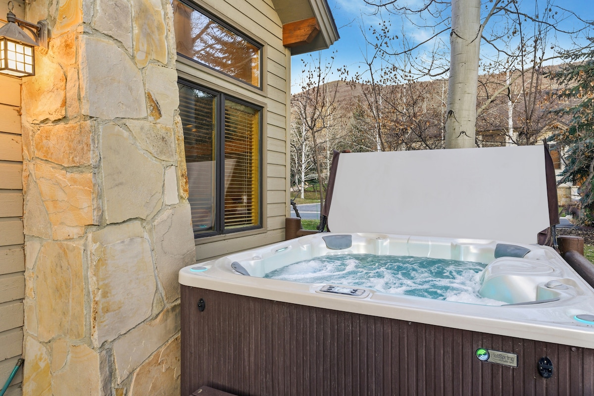 Wonderful Townhome for Ski-In and Gondola out with Luxe bedding, exposed timbers, large hot tubs, fire pit, private grill, washer & dryer and garaged parking spot. Lyft to the house in 35 minutes from SLC and free PC shuttle to navigate your trip...truly no car needed. Take a snow covered path through the Aspen forest on a 5 minute walk to the free NEW SKYWAY GONGOLA into Canyons Village! 4 season outdoor paradise straight out the front door. Perfectly situated to do it all in Park City! NEW AC!