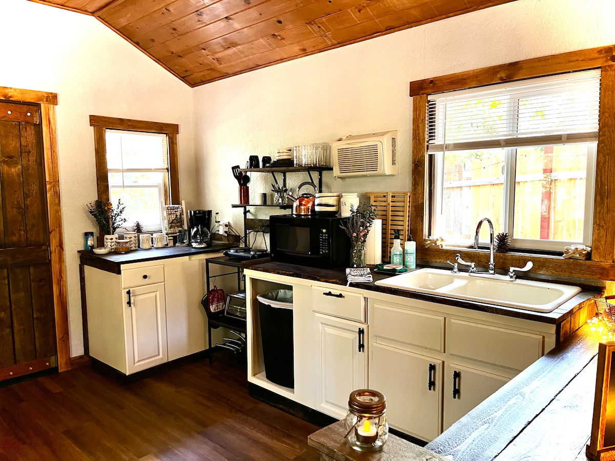 Spread out in 1500 sq. ft. of rustic charm! Located in the original barn on our property, this converted duplex features a fully stocked kitchen, full bathroom, and two private bedrooms. One bedroom offers a queen bed and cozy reading chair; the other includes a queen bed and twin bunk beds. The Kids’ Loft & Game Room has two twin beds and a spacious common area with soaring 20’ ceilings—perfect for relaxing after a long day of exploring. Dog-friendly but do not allow cats due to allergies