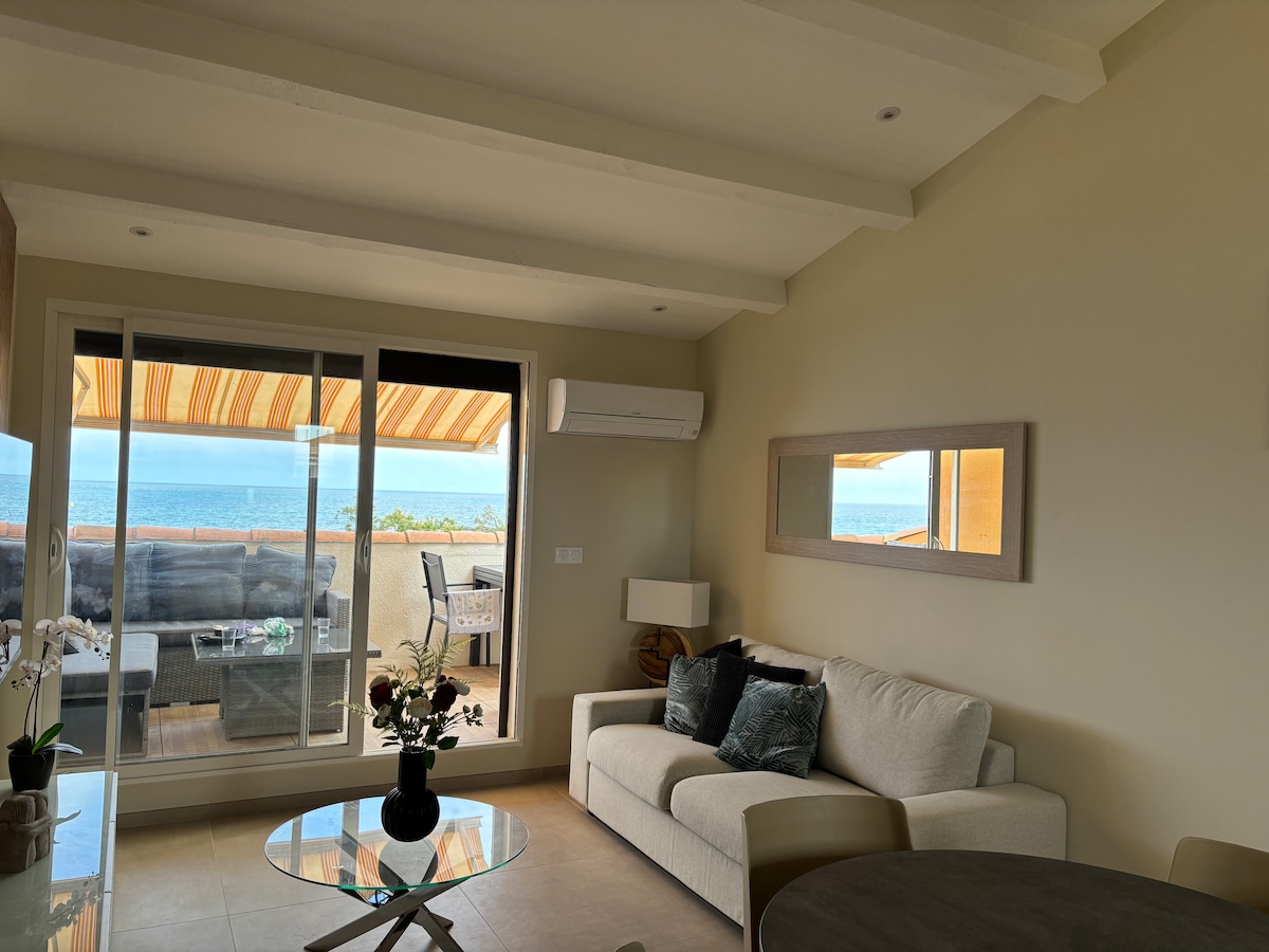 Agréable appartement de 45 m2, 2 pièces + mezzanine. Spacieux et lumineux, face mer, climatisé, 3ème étage ascenseur. Superbe vue panoramique sur la mer, Fort Brescou et l'avant-port, sans vis à vis. Séjour avec grande baie vitrée donnant sur terrasse orientée sud, à l'abri des regards, store banne motorisé et meubles de jardin. Cuisine et salle d'eau refaites à neuf en 2023. Chambre avec grand lit de 160 cm. Mezzanine à l'étage avec 2 lits de 90 cm. Parking gratuit sécurisé.