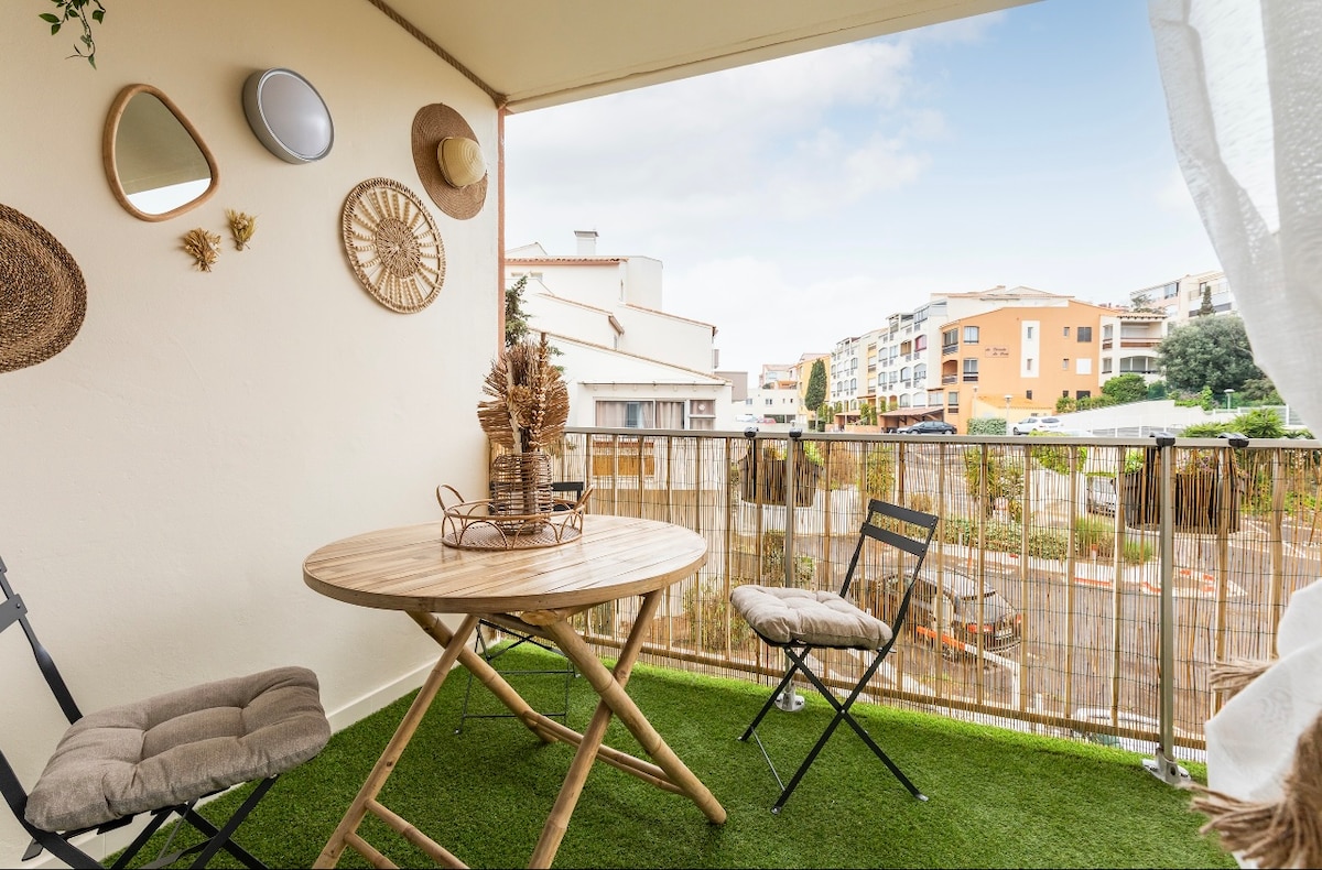 Apartment 5 people (separate sleeping for children) Close to all amenities, everything is on foot: Beaches (conch, plagette, mole) Access center port (shops, entertainment, restaurant) Air conditioning - Internet - wifi (box) - Secure parking Pool with loungers (two pools - one for the little ones) The apartment is fully equipped (large fridge-freezer, dishwasher, washing machine, connected TV, sofa. Open terrace overlooking the boats (umbrella, outdoor table and chairs)