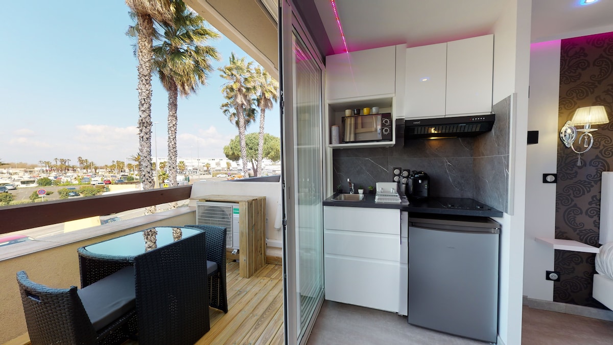 Nous vous proposons de faire une pause dans ce nid d'amour, chic et glamour. Le logement vient d'être refait à neuf du sol au plafond pour votre plus grand confort. Vous apprécierez les jeux de lumières, la literie neuve et de grande qualité et sa décoration à la touche baroque. Climatisé pour les chaudes nuits d'été, le logement se compose d'une entrée avec placard, d'une petite cuisine équipée, d'une magnifique salle d'eau ouverte sur la chambre et d'une jolie terrasse avec vue sur le port