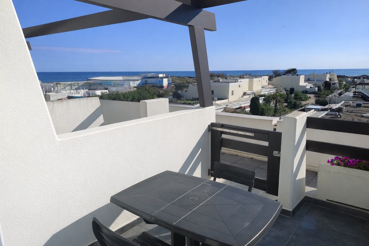 COMPLETE RENOVATION 23 Sea and beach amazing view ...From the wooden terrace, you can have breakfast at sunrise facing the sea, take a nap on the sofa or have an aperitif and enjoy the sun set. Located on the 3rd floor (with lift) of the Héliopolis residence, this studio is fully equipped (air conditioning, 160x200 bed, plenty of storage, bathroom, separate WC, kitchenette). Bed linen and towels are provided, as well as WiFi and a private parking place.