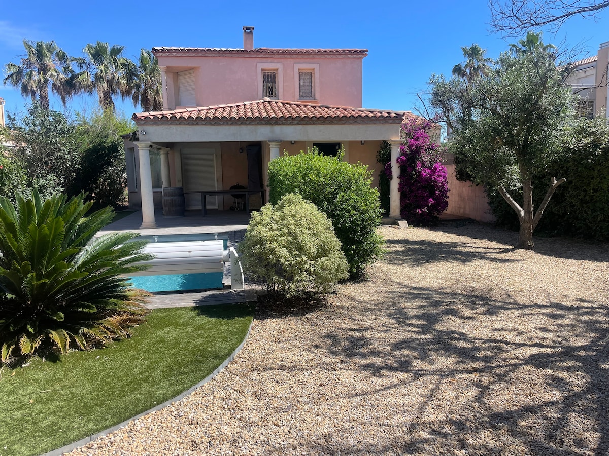 Jolie maison neuve avec piscine chauffée (avril-octobre), jardin paysagé, située à 5 min des plages et du Cap d’Agde. Vous profiterez d’un cadre calme et confortable pour des vacances réussies. Terrain de pétanque éclairé et table de ping-pong pour partager des moments conviviaux en famille ou entre amis, de jour comme de nuit.
