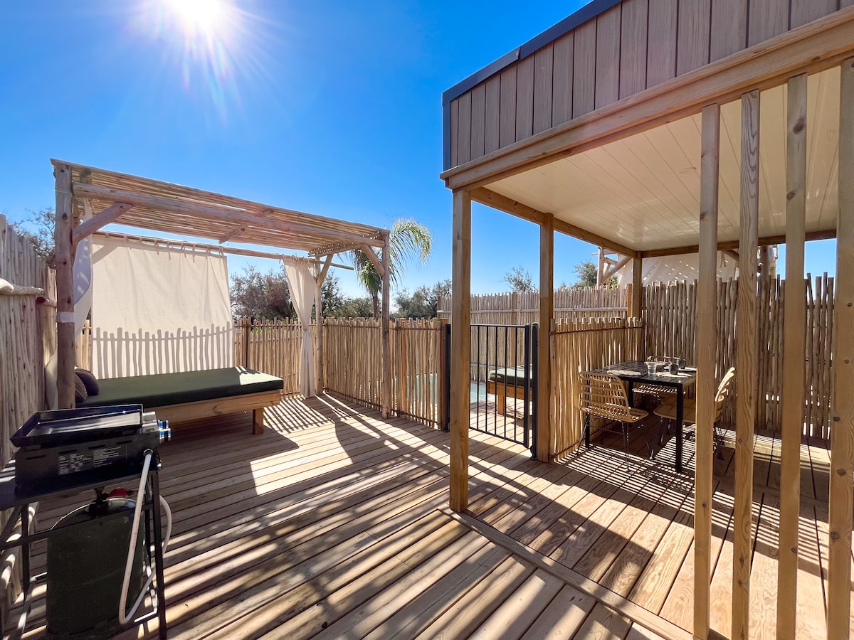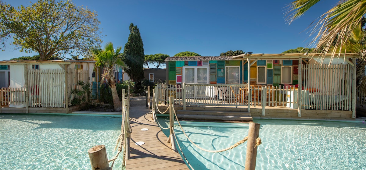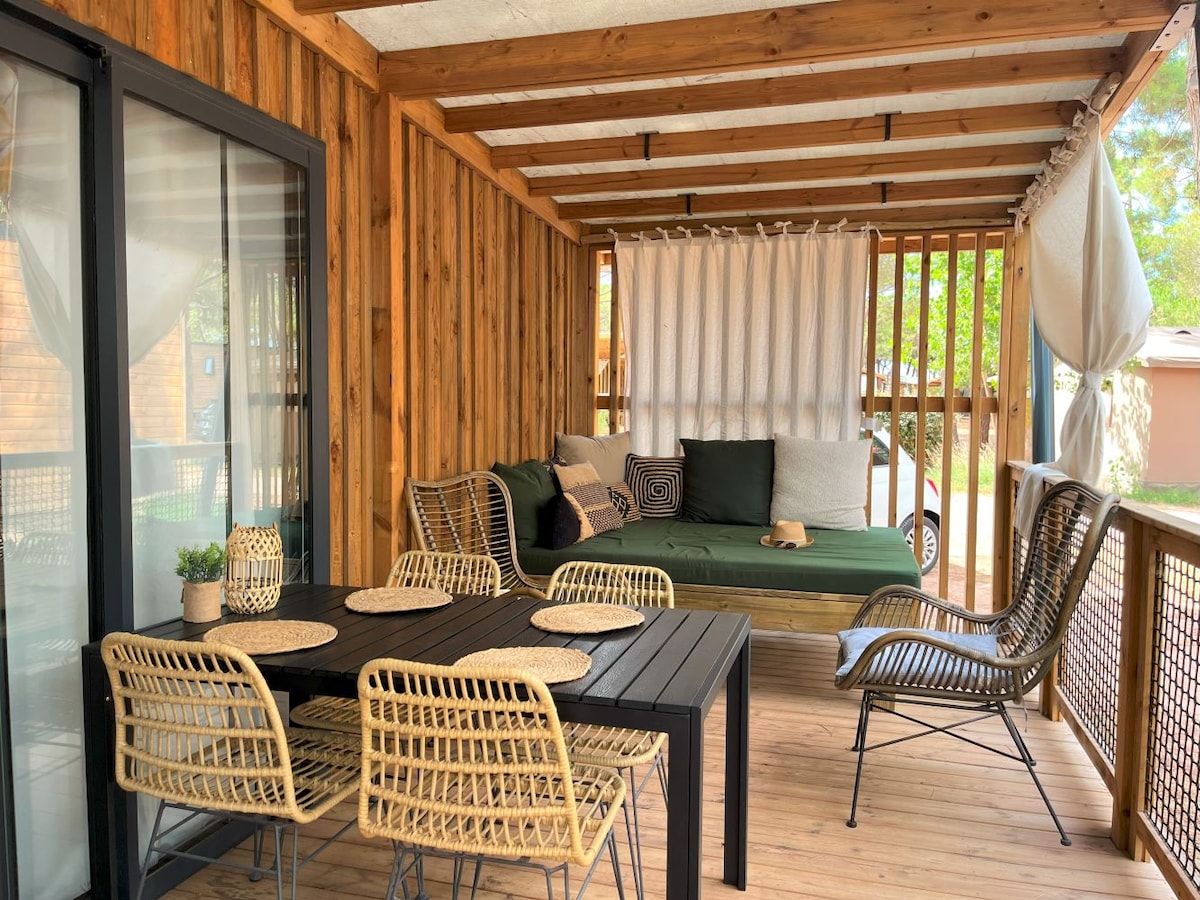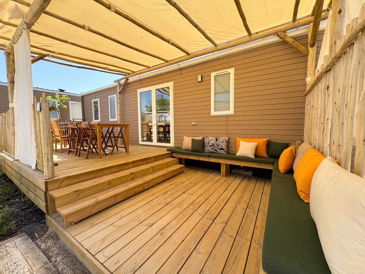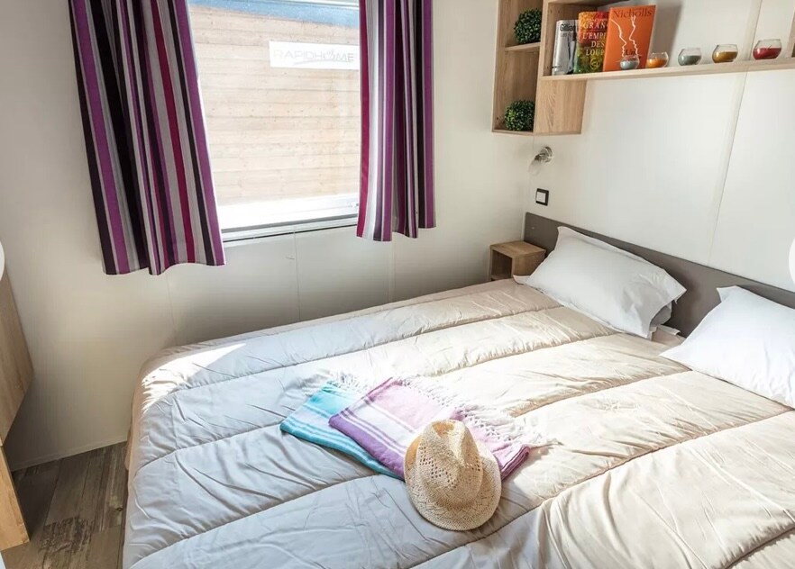 3 Chambres, 2 Salles de Bain, 2 WC, Clim, grande terrasse couverte fermée Idéal avec bébé où un lit parapluie peut être installé en basculant un lit sous l’autre Draps et serviettes non fournis, ménage non inclus Espace aquatique ouvert d’avril à octobre, avec « Fun-pass » à acheter au camping, Toboggans, zone jets, pataugeoire, jacuzzi… espace fitness, aires de jeux, terrain de pétanque, ping-pong, tennis, terrain multi sports, club pour enfants, supérette, bar, restaurant, animations
