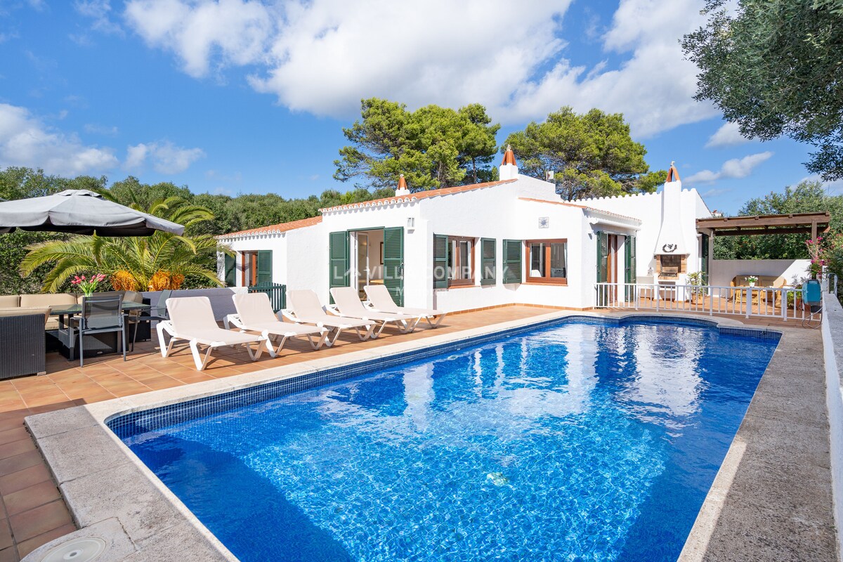 Coqueto chalet con vistas al mar, cerca de la gran playa de Son Bou, en una calle tranquila al final de la urbanización de Torre Soli Nou, a 18 minutos caminando a la playa y a 4 del Cami de Cavalls que lleva hasta Santo. Tiene una terraza exterior y una hermosa piscina (5.5x3.5metros), no climatizada, rodeada de un jardín de flores muy bien cuidado. Una escalera conduce a la terraza para disfrutar de las vistas al mar. https://instagram.com/lamaison_de_lo?utm_medium=copy_link