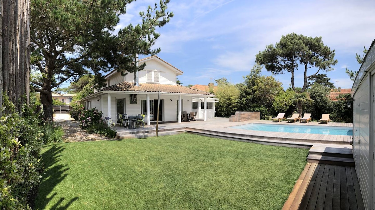 Somptueuse villa au centre du cap ferret, vous pouvez laisser la voiture et tout faire à pied. Au rez-de-chaussée, salon équipé d'une TV / Netflix, avec des jeux pour enfants, une cuisine toute équipée. Il se compose également de deux suites parentales avec dressing + salle de bain A l'étage, deux chambres/ salle de bain idéal pour des enfants. piscine chauffée, un terrain de pétanque. ATTENTION les draps ne sont pas fournis il faut payer 30€/ pour lit 2 places et 15€/ petit lit