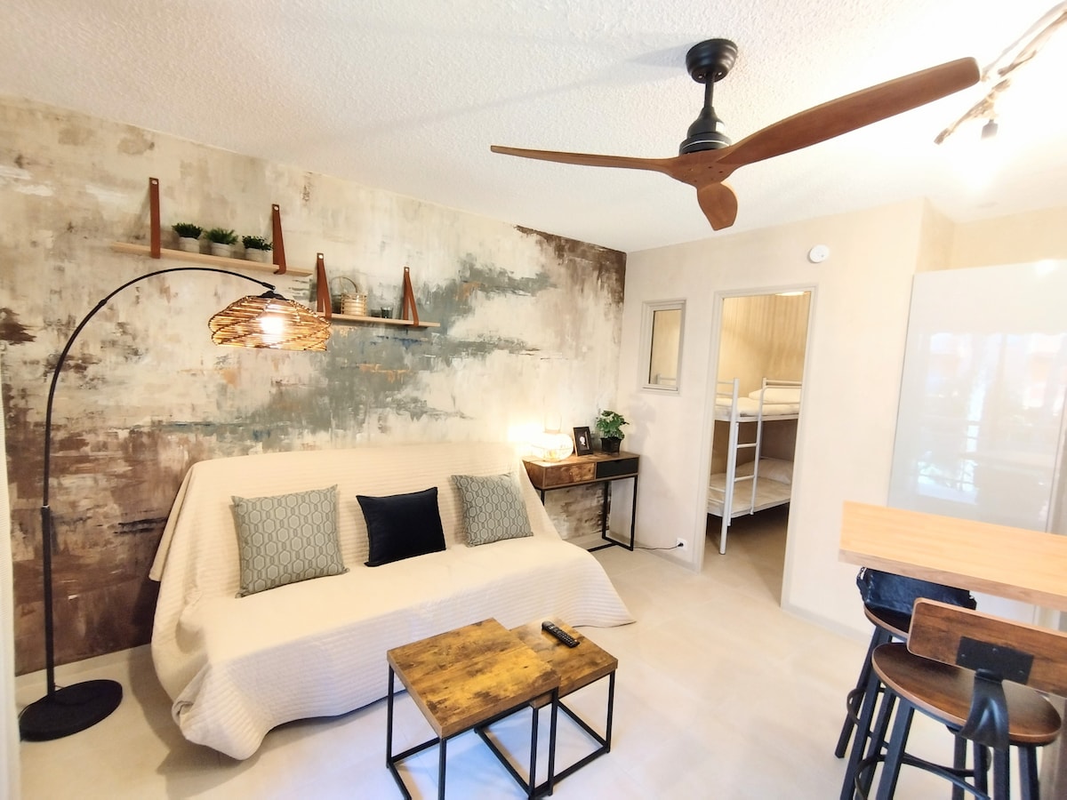 Studio 25 m2 climatisé (réversible) entièrement rénové, au 5ième étage avec ascenseur, accès direct à la plage par la résidence. Idéal pour 1 couple, voir 1 couple avec 1 bébé (Possibilité lit parapluie) Entrée couloir distribuant, salle d'eau et placard avec penderie. Cuisine ouverte au séjour Salon/Séjour, ouvrant par baie vitrée coulissante vue sur la mer . WC indépendant. Lave linge Terrain tennis (voir les dispositions et conditions avec le gardien) Parking gratuit . Draps & Serviettes
