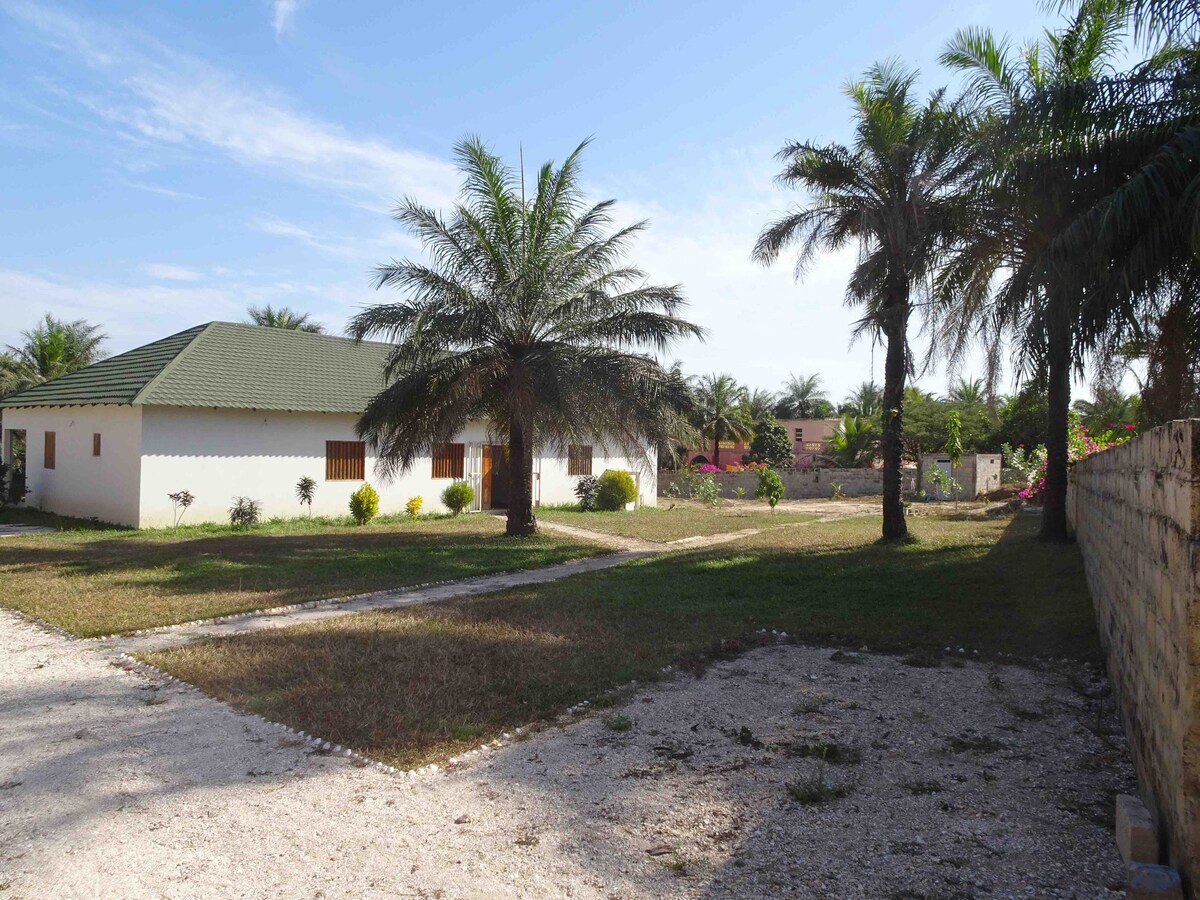 LA RÉSERVE Grande maisons au centre de Cap skirring La cuisine est entièrement équipée, frigo, gazinière, cafetière électrique. 1 chambre avec salle de bain 2 chambre avec salles de bain commune Serviettes de douche, draps. Terrasse avec table à dîner barbecue Terrain 3800 m² clos, jardin arboré, végétation luxuriante Endroit calme, belle vue sur le bolong palmiers cocotier A 1 Km de la plage et 200 m du centre du village. Ventilateurs dans le séjour salon et les chambres. WIFI