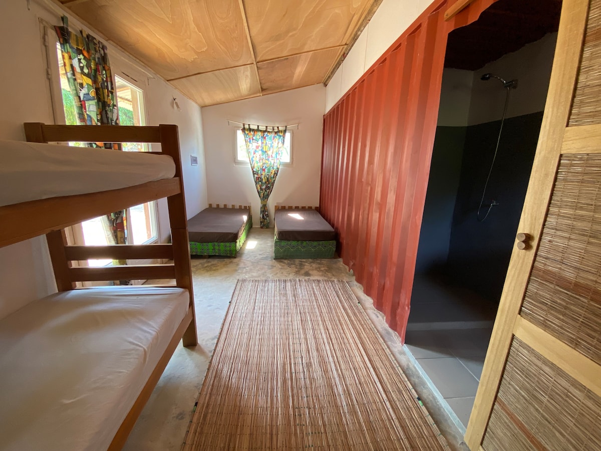 A gauche la plus belle plage de la zone, à droite le village de Boucotte, le tout à 10 min à pieds ! Au cœur de l'éco-lieu Nio Far, votre hébergement se compose d’une chambre pour 3 et d’une salle de bain. La déco est soignée et les matériaux locaux. Vous avez accès à une cuisine équipée partagée. Le site verdoyant dispose de plusieurs hébergements et d’un spacieux espace chill, repas, détente... Ambiance zen et chaleureuse. La location est 100% au profit de l'association et de ses actions !