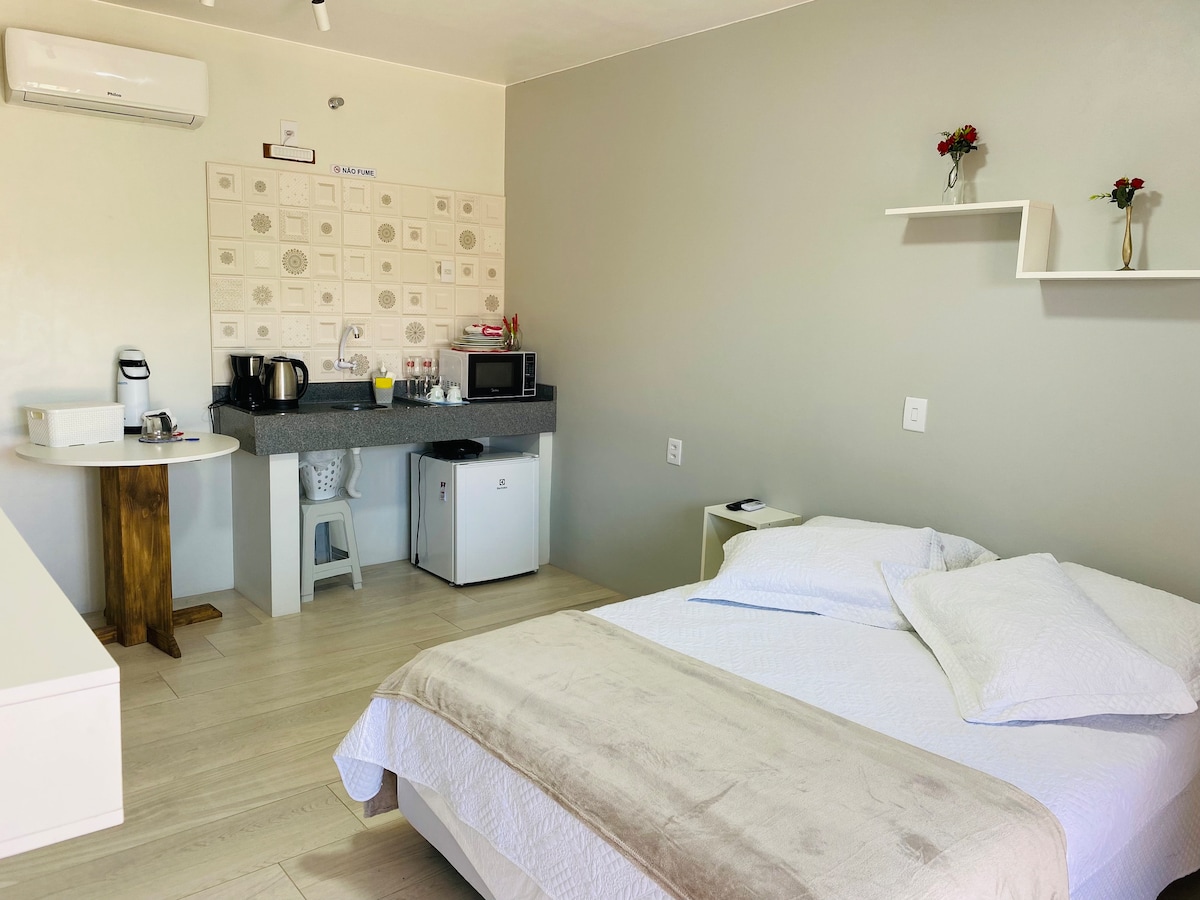 Suíte individual com cama box casal, ar condicionado, frigobar e banheiro privativo novo e moderno.