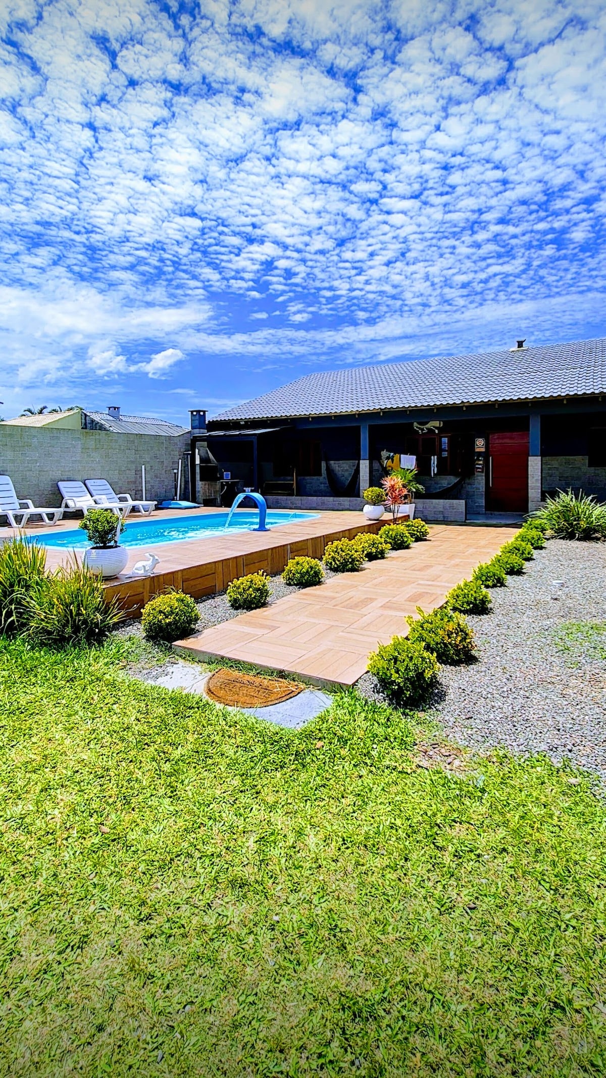 Leia as REGRAS DA CASA antes de reservar. Você estará de acordo em cumpri-las quando efetuar a reserva. Casa com 3 quartos, sendo 1 suíte cama queen, 1 quarto casal e 1 quarto dependência de empregada com cama casal. Ar condicionado em todas dependências. Piscina com aquecimento solar, wi-fi, mesa de sinuca, churrasqueira externa e interna, forno, micro, etc. A casa acomoda até 8 pessoas, contando com o sofá da sala. Endereço: Bairro Atlântida-Cidade Xangri-la