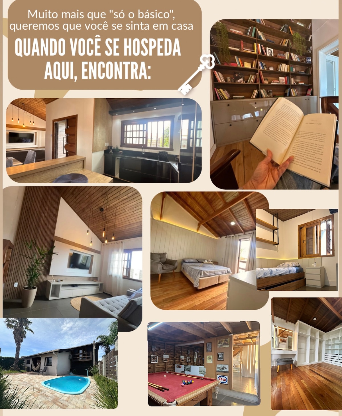 Casa com piscina, 2 quartos, sendo 1 suíte, ambos com ar-condicionado. Sala de estar aconchegante integrada com jantar. Cozinha completa com todos eletrodomésticos e utensílios. Lavanderia com máquina de lavar. Quintal espaçoso ideal p/ famílias. Localizada na entrada de Atlântida a 3,2 km da beira mar (6 min de carro), 3 min do Ramblas. Duas quadras de mercado, padaria e açougue. *Informe a quantidade exata de hóspedes ao fazer a reserva!