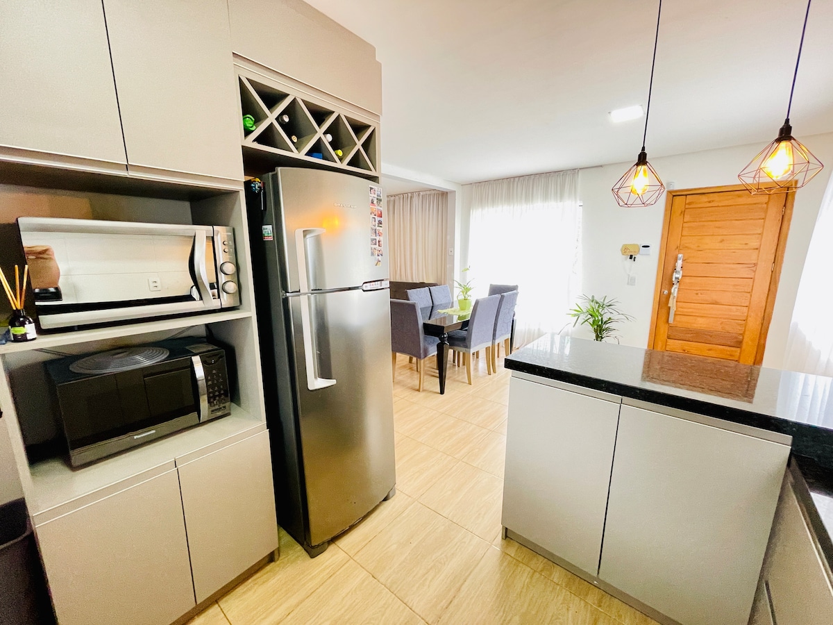 Leve toda a família a este ótimo lugar com muito espaço para se divertir. Localiza-se a poucas quadras da praia, lugar tranquilo, próximo a mercados e todo comércio em geral, a 5km do centro da cidade. A casa possui 3 quartos, 1 c/suite, sala, cozinha e espaço gourmet integrados com churrasqueira e fogão a lenha, 1 banheiro social 1 lavabo, lavanderia, garagem, pátio nos fundos bem espaçoso para lazer. Fica a 700m da praia.