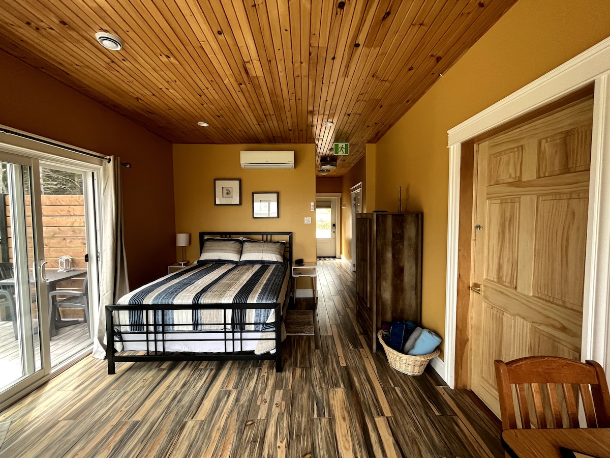 On the shoreline of the Cabot Trail. This Private A.C Suite has a Queen Bed. Little kitchenette that includes a mini fridge, microwave and coffee maker. Coffee and Tea provided, T.V, Wifi and Netflix. Private entrance front and back. Private bathroom with shower. Ceiling fan, Private deck, bbq if needed. Large back yard on coast with great view of the water. Picnic tables and chairs provided Check out our Amenities section for more details. (Sorry we do not provide Breakfast)