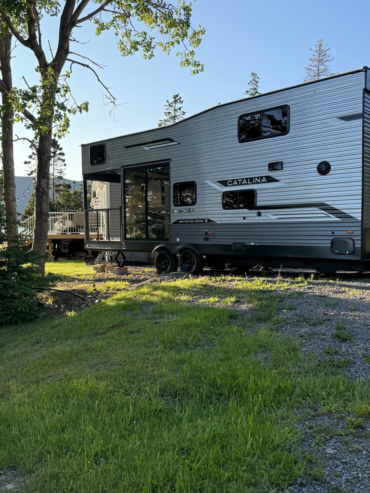 Glamping von seiner besten Seite: Die magischen, gemütlichen, unbewohnten Inseln und der atemberaubende Panoramablick von diesem erhöhten, geräumigen Slide-Out-Camper mit Blick auf den tiefblauen, glitzernden Ozean ist DER Zufluchtsort für entspannende, friedliche Ferien, Kajakfahren, Wandern, Radfahren, Schwimmen, Lesen, Schreiben. Da die Bucht von Little Barachois mit ihren unbewohnten Inseln viel zu bieten hat, empfehlen wir, Angeln und Wassersport mit Ihrem Aufenthalt zu verbinden.