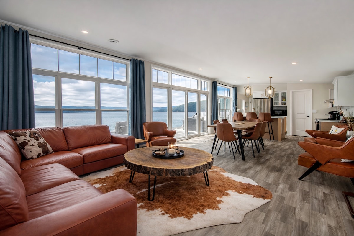 Welcome to “Point Beithe” (birch point in Gaelic). This beautiful home sits on its own point surrounded by 180° of Mira River waterfront age. You will also enjoy access to your own small private island that is connected by a shallow sand bar. Sit out on the large deck or floating dock to enjoy the views of the river, launch kayaks, paddle boards, and swim. We have signed up for the strongest internet service offered in the area (Starlink). Cellular reception is not great in the area.