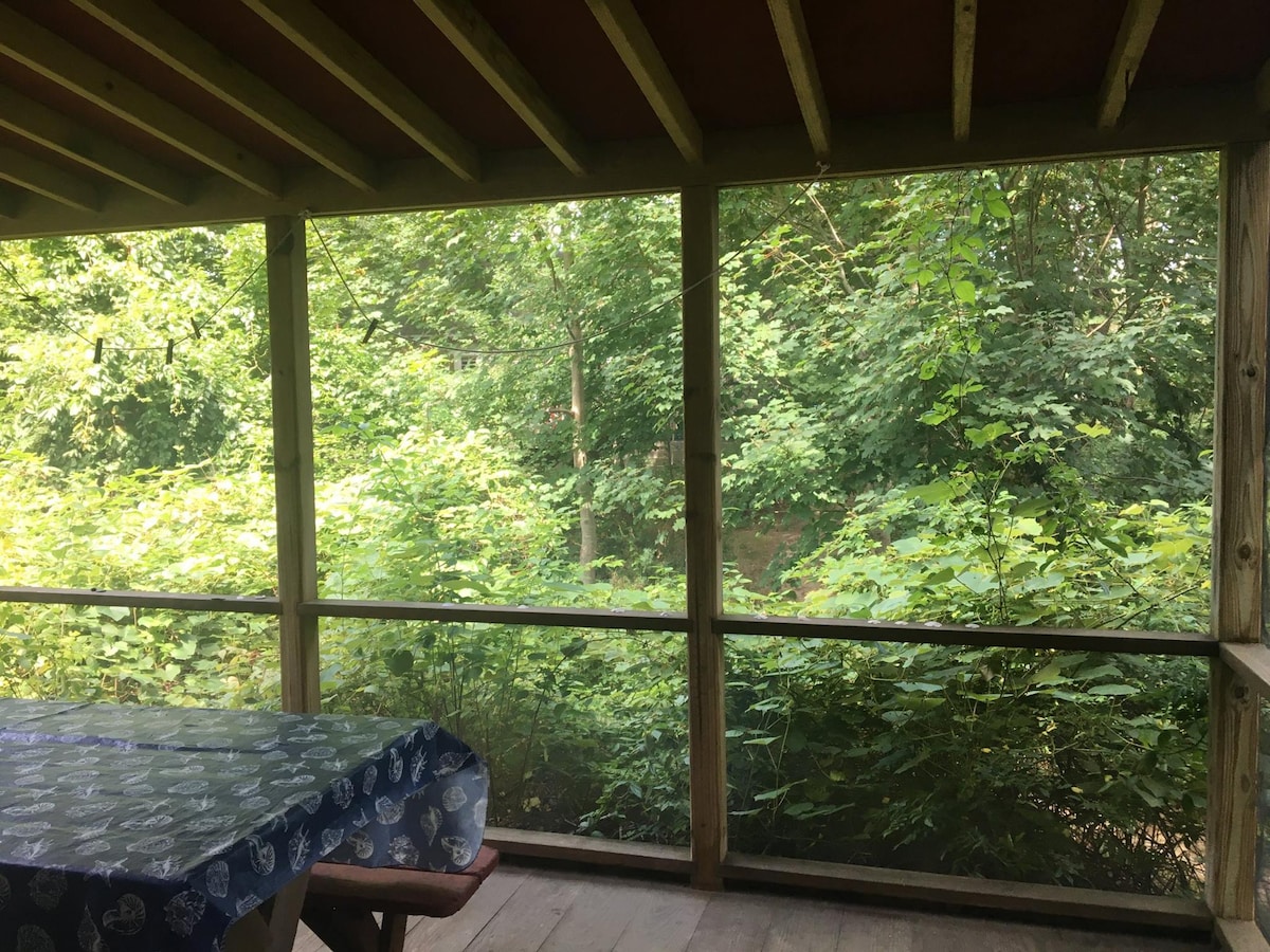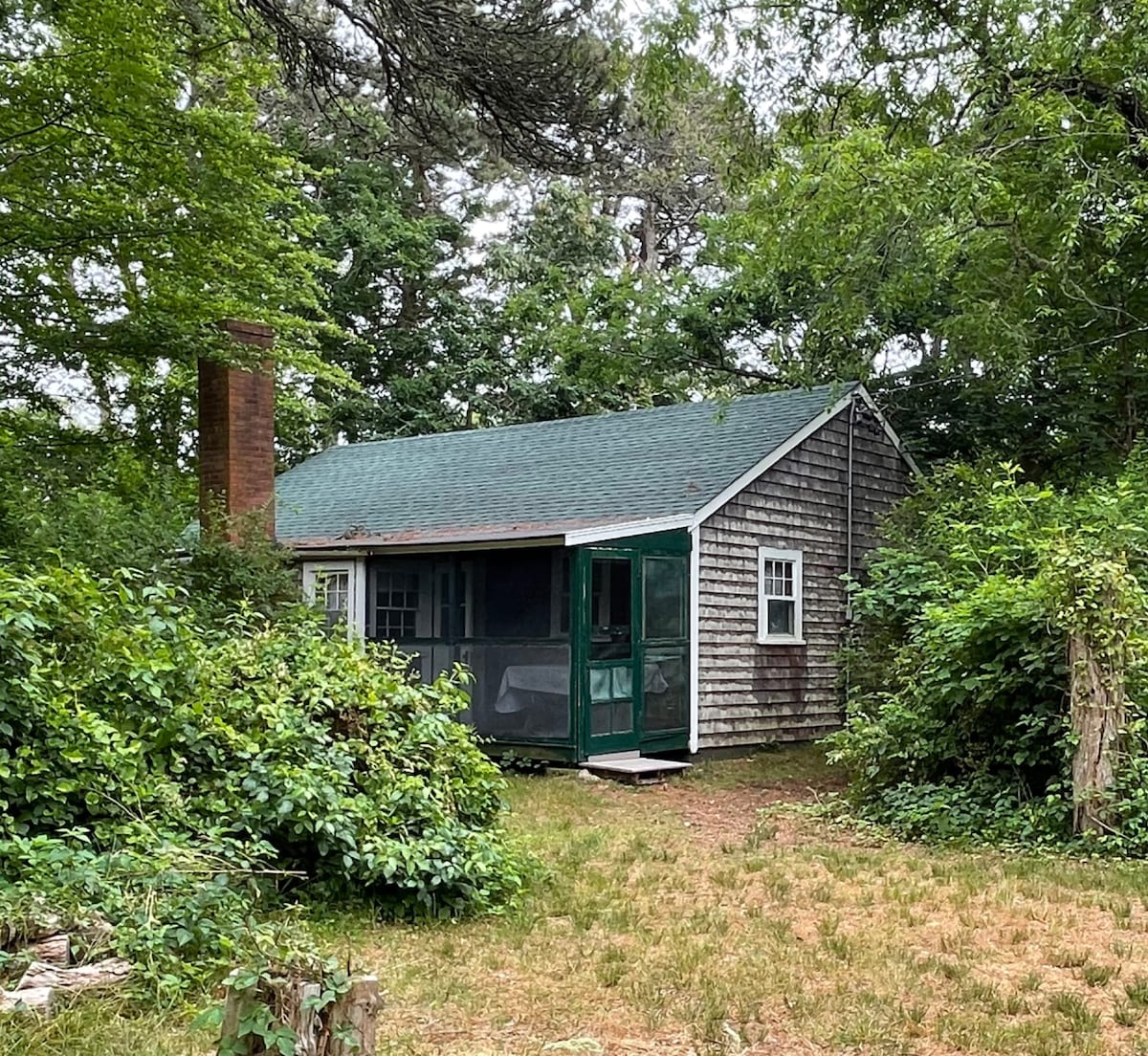 A rustic cottage built in 1940 nestled in the woods. This no-frills escape offers a step above camping, with running hot water and a full kitchen. Private beach access across the street. This is a back-to-basics retreat with no Wi-Fi, AC, TV or modern amenities (simple hook & eye locks). Guests bring their own linens and toiletries