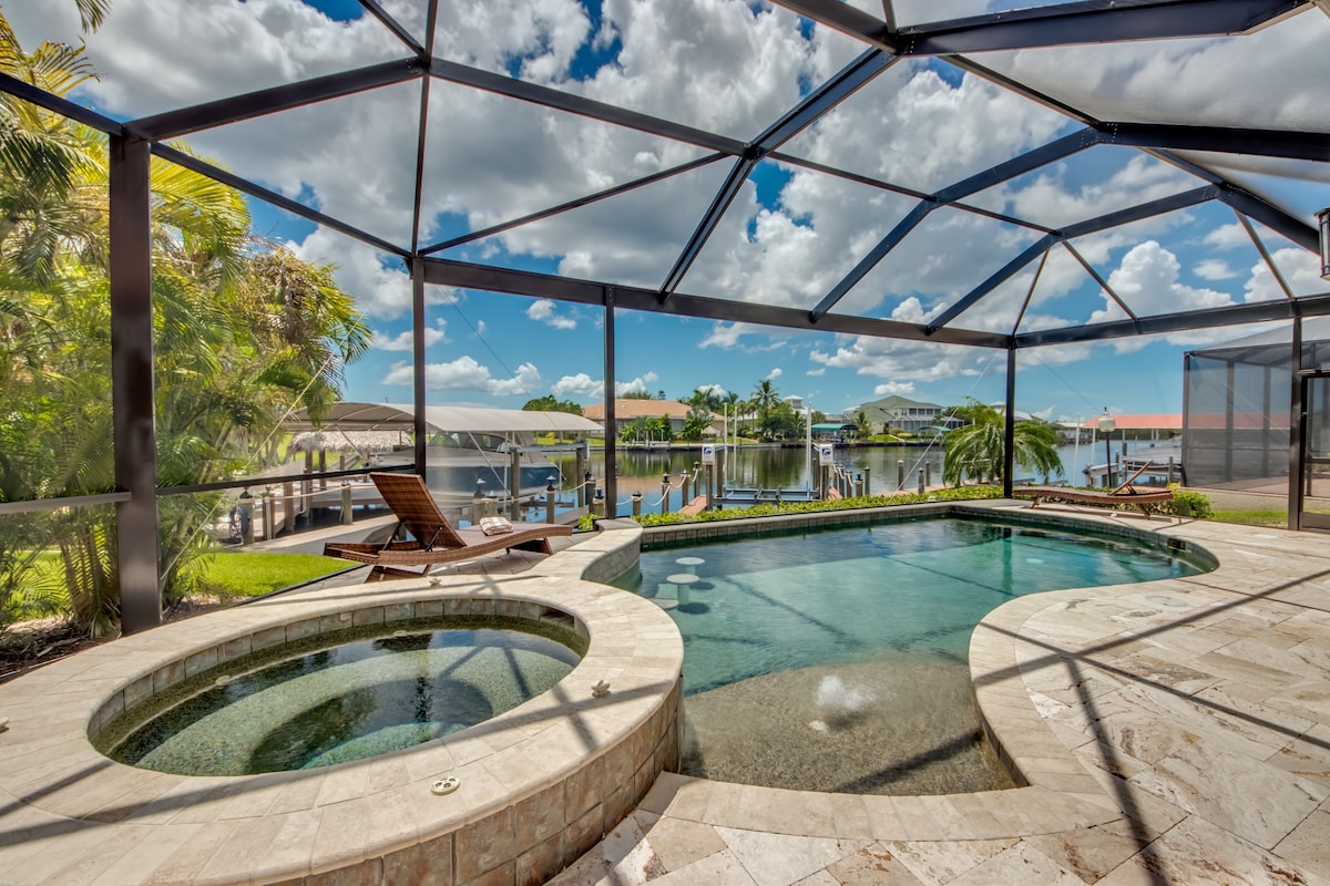 Welcome to your dream vacation home in sunny Florida! This luxurious retreat offers a spacious 4BR/3BA Cape Coral waterfront villa for 8 with a private pool, hot tub, chef’s kitchen, free parking, pet-friendly policy, and reliable Wi‑Fi—perfect for families, couples, business travelers, and remote workers. Casa del Lago is a luxurious waterfront getaway designed for those who seek both relaxation and indulgence.