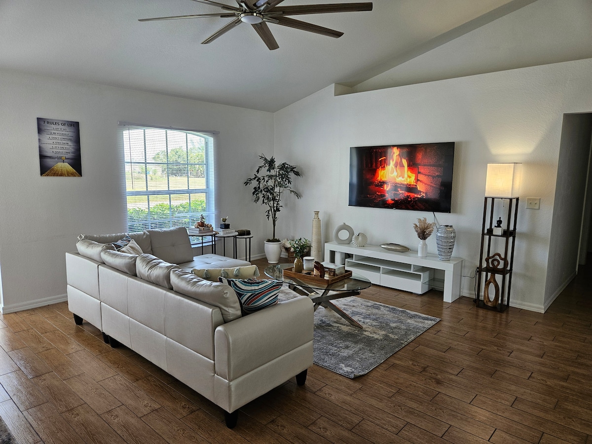 ¡Escapada familiar a Villa Coral. Tu oasis en Cape Coral. Esta espaciosa casa es perfecta para el descanso: 4 habitaciones, 4 camas, 2 baños, sala, cocina y comedor integrados. Cada habitación tiene su TV. Disfruta de una terraza cubierta ideal para compartir y un patio espacioso para niños y mascotas. Cerca de los proyectos más importantes de la zona y a solo 40 minutos en coche de las playas del área, como Fort Myers Beach o Sanibel Island. Garaje para 2 autos. Reserva ya, vive tu experiencia