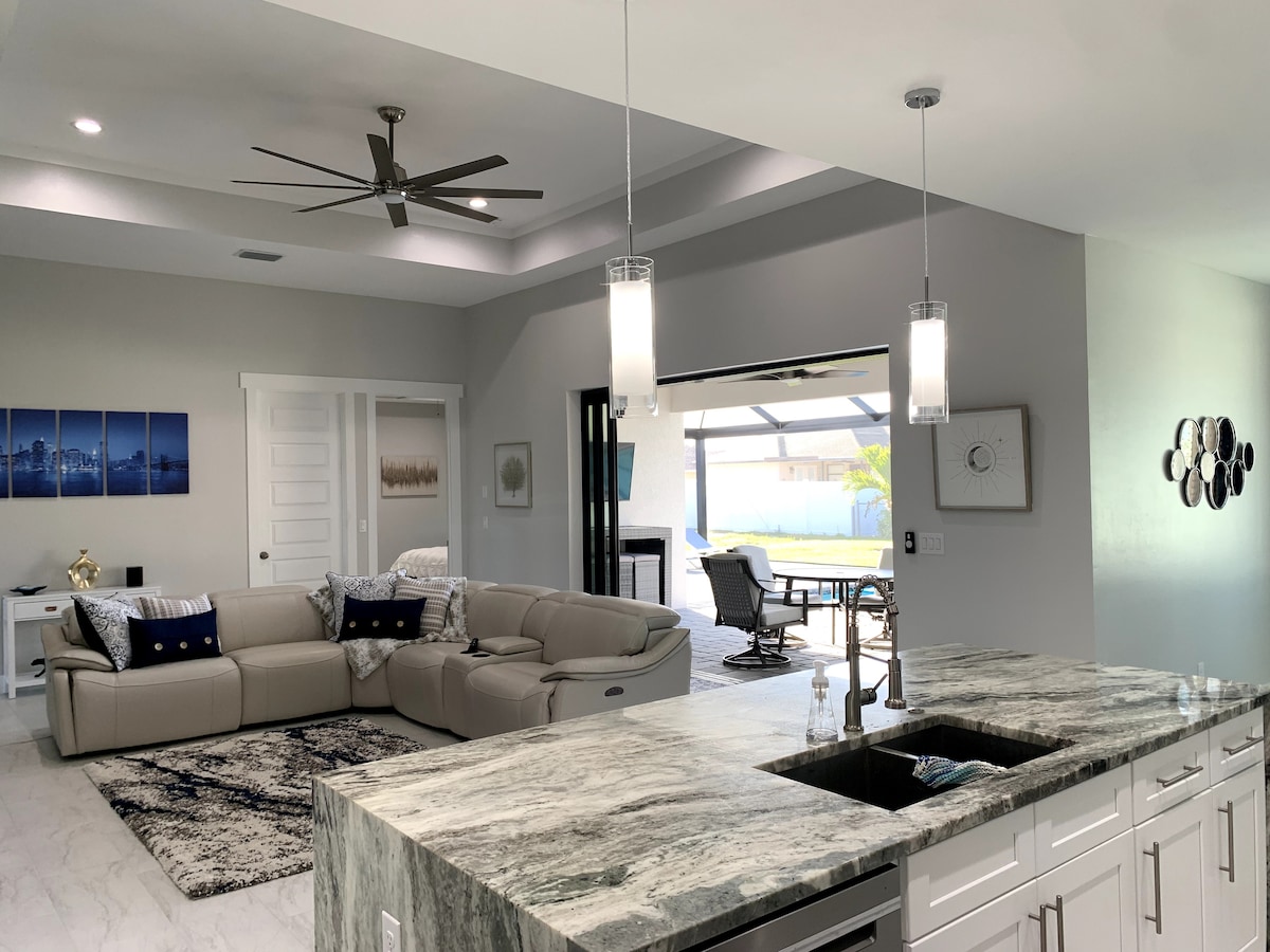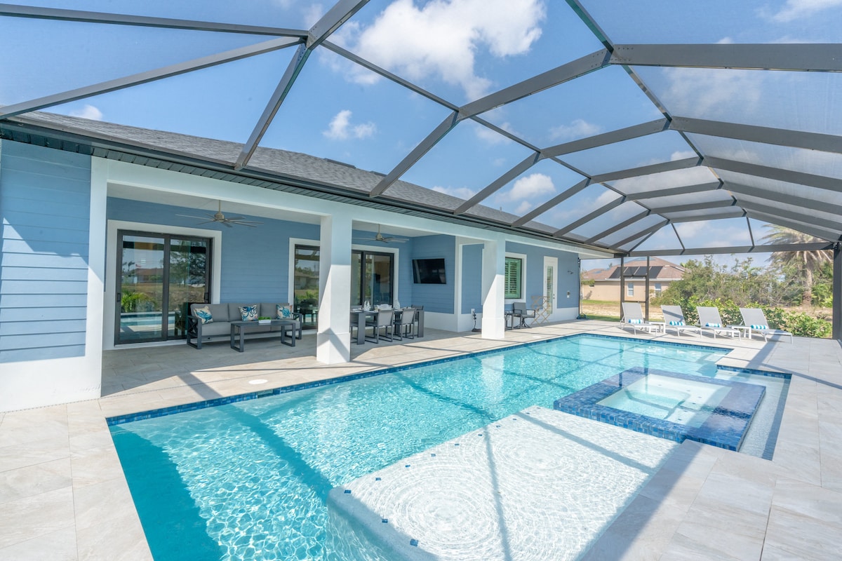 Unwind Cape Coral welcomes you to sunny southwest Florida, close to magnificent beaches, fishing, shelling, Minnesota Twins Spring Training & much more. Come enjoy this new construction home with heated pool, Kayaks, heated and cooled game room (PlayStation 5), gulf access - salt water canal, 4k oled tv's & many more refreshing amenities. You will love this clean & bright home with lovely décor. Located in the highly sought after Pelican neighborhood of Southwest Cape Coral!