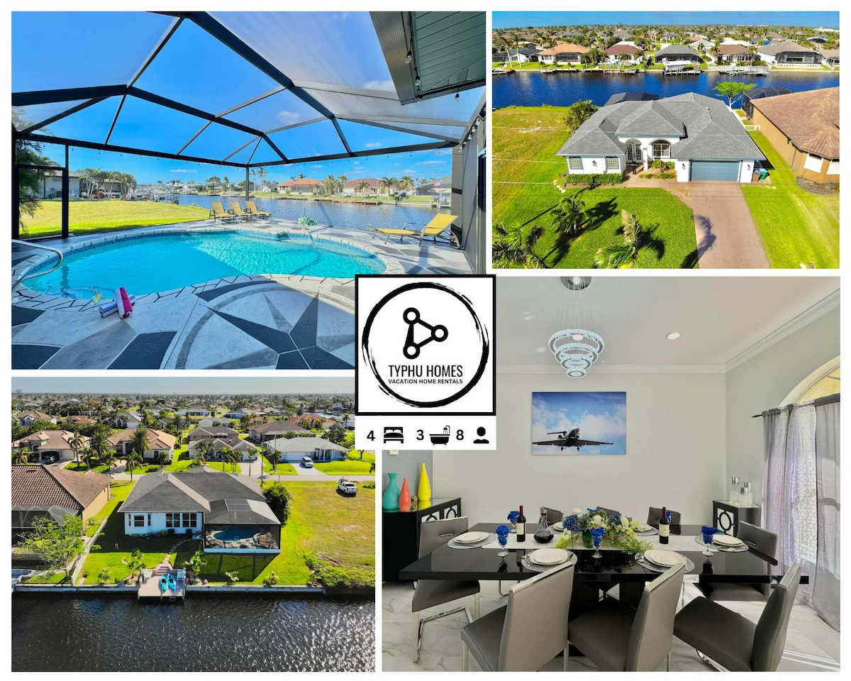 -5 min to Downtown Cape/10 min to Yacht Club Beach, 20 min to Causeway Beach, 25 min to Ft Myers & Sanibel Beach -Tropical fenced backyard w/ pool, hot tub, gas firepit, swing chair, hammock & Blackstone grill -Beach essentials, boogie boards, umbrellas, beach wagon, cooler & chairs -Board games, ping-pong, corn-hole, darts, 2 kayaks+life jackets -2 Beach Cruiser bikes + helmets -Relaxing enclosed covered patio + string lights, neon sign & grass wall -Canal access for kayak launch 5 min away
