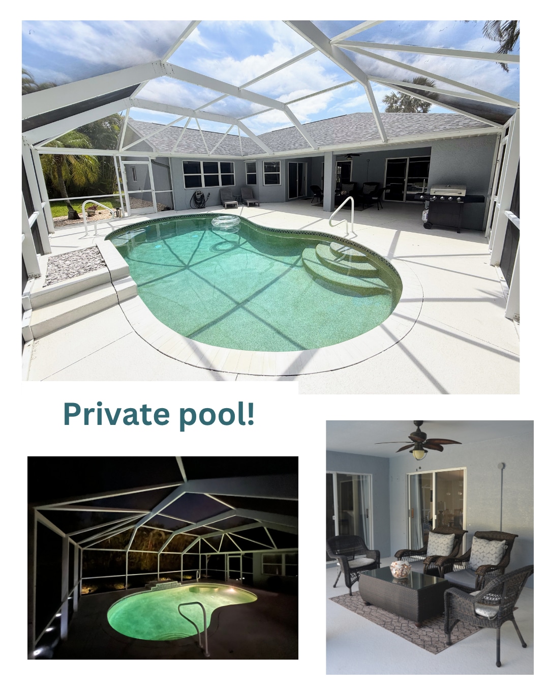 Relax with the whole family at this peaceful place to stay. FULLY Furnished Home. Your beautiful Heated pool has a sun shelf with a bubbler, and LED light.Full Electricity is included in Airbnb price for a setting of 82 deg. 3 bed+den, 2 baths, and a 3 car garage. Impact glass doors and windows. 8 ft doors! In the master bedroom you will find two walk-in closets, dual sinks, a separate tub and rain shower head. Room for kids to play or pets to roam! BBQ Grill w searing station included.