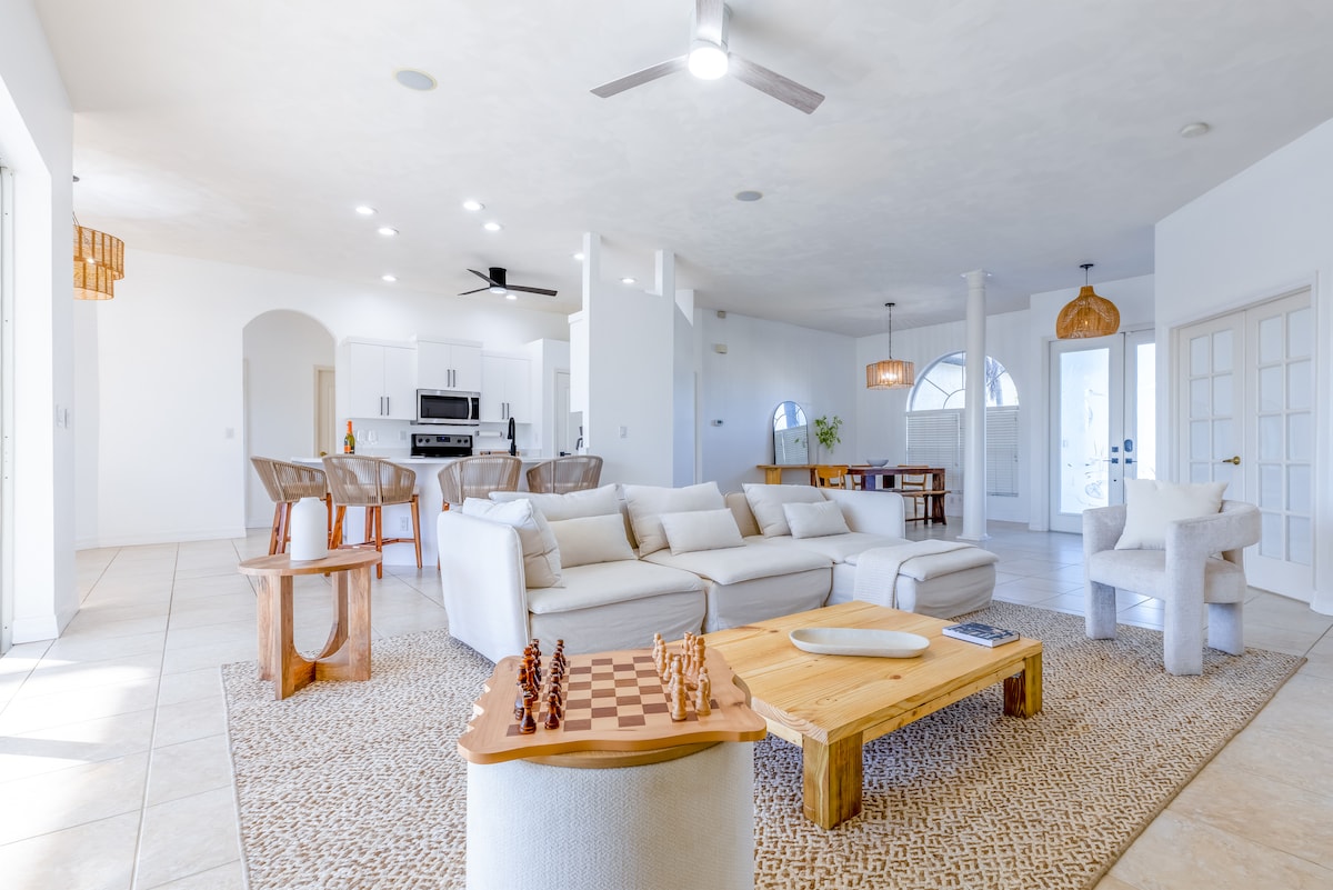 -5 min to Downtown Cape/10 min to Yacht Club Beach, 20 min to Causeway Beach, 25 min to Ft Myers & Sanibel Beach -Tropical fenced backyard w/ pool, hot tub, gas firepit, swing chair, hammock & Blackstone grill -Beach essentials, boogie boards, umbrellas, beach wagon, cooler & chairs -Board games, ping-pong, corn-hole, darts, 2 kayaks+life jackets -2 Beach Cruiser bikes + helmets -Relaxing enclosed covered patio + string lights, neon sign & grass wall -Canal access for kayak launch 5 min away