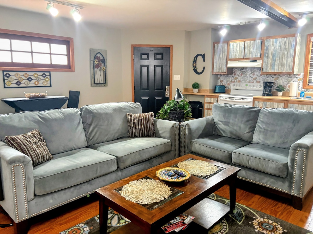 A modern, upstairs loft with a private, second story deck where you can enjoy your morning coffee to your evening glass of wine. A historical triplex built in the early 1900’s that has recently been completely renovated to bring the perfect mix of old and new. Every detail has been meticulously thought of, from the organic bedding to the high end furniture and finishes, to the full kitchen. Right down the steps, you are walking distance to a beautiful park, shops, dining, and live theater.