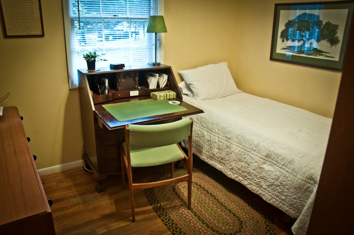 This is a bright room with a south facing window that looks out over the front yard. There are multiple guests staying here that are respectful and mature. The room has hardwood floors with a single bed and desk. There is a shared bathroom, kitchen and living room. The bus stop to Duke and UNC is nearby. There is a lovely nature walk behind the house and lots of birds and wildlife in the yard and area. No smoking on the premises permitted.