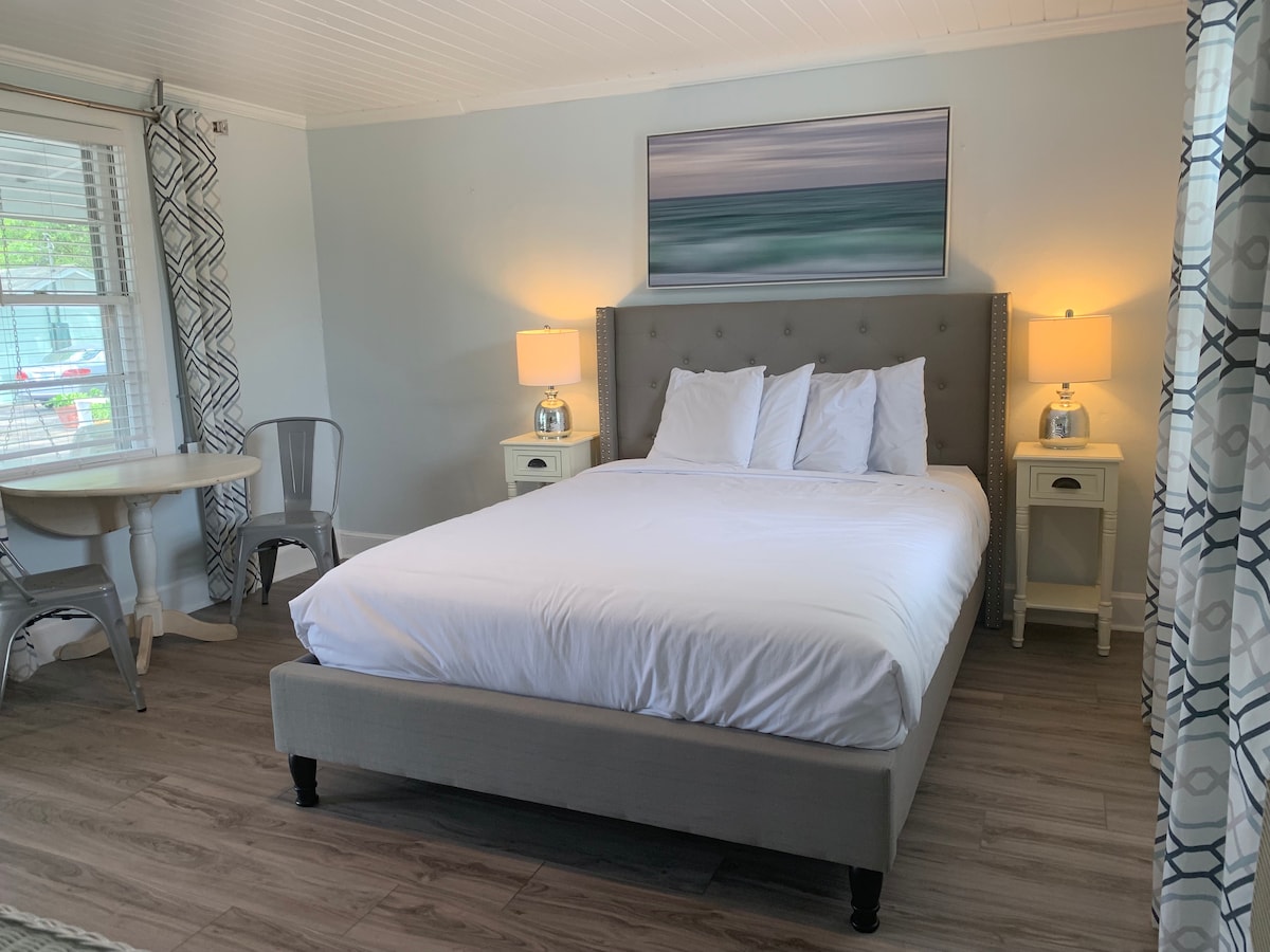 The Inn at Southport is located in the heart of Southport, just five blocks from the waterfront, surrounded by shops and restaurants. Room 4 at The Inn features 1 queen bed and is newly renovated. The room has a small dining table, a flat-screen TV, a mini-fridge, a microwave, and a coffee maker. The private bathroom is accessed through the bedroom. While updated, this is a 1954 building and retains much of the charm of the day!