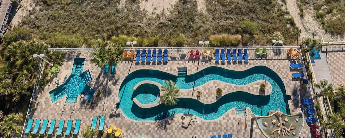 The water awaits! Pool view and beach across the street! Ground floor efficiency condo, complete with comfy beds, walk-in shower, easy access to the courtyard, parking, seasonal pools, and lazy river! Enjoy coffee on the patio and see the teal tides through the palm trees! Five minutes from the Boardwalk, Strip, and airport, and walking distance to TONS of restaurants, shops, and attractions! Calming coastal design - Teal Tides is a hidden gem, right along Myrtle Beach's coastline! 🌴🌊