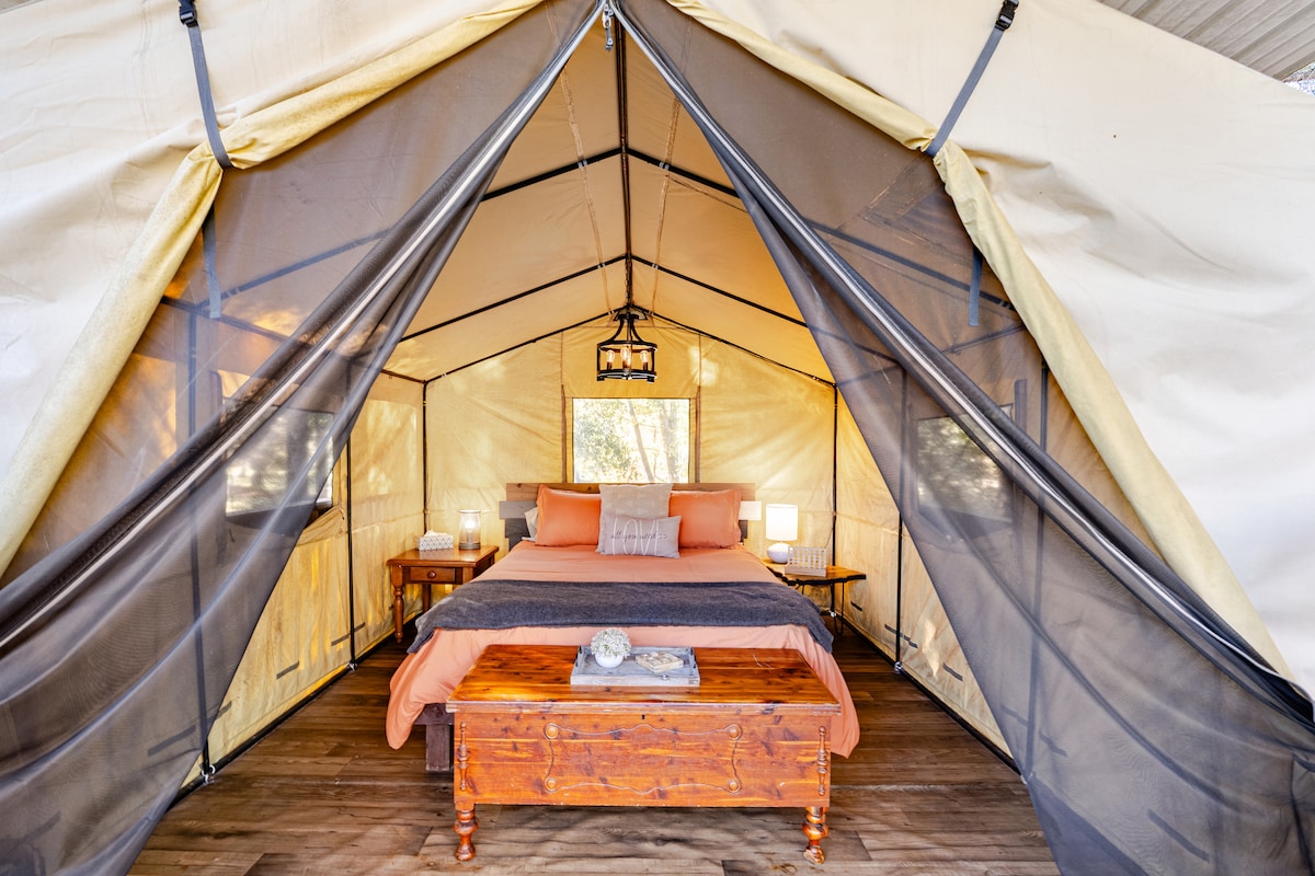 This Natural escape, farthest site on the property, gives you comfort & style-with all the modern conveniences! The Miss Alice Tent, this 2 bedroom escape, with your private covered porch is fully furnished to breathe & take in the views, steps away from your own private bathroom. The Sugarneck community features wifi, walking trails, ice machine & communal grill area, lawn games, TV lounge/game room as well as plenty of outdoor spaces to explore!