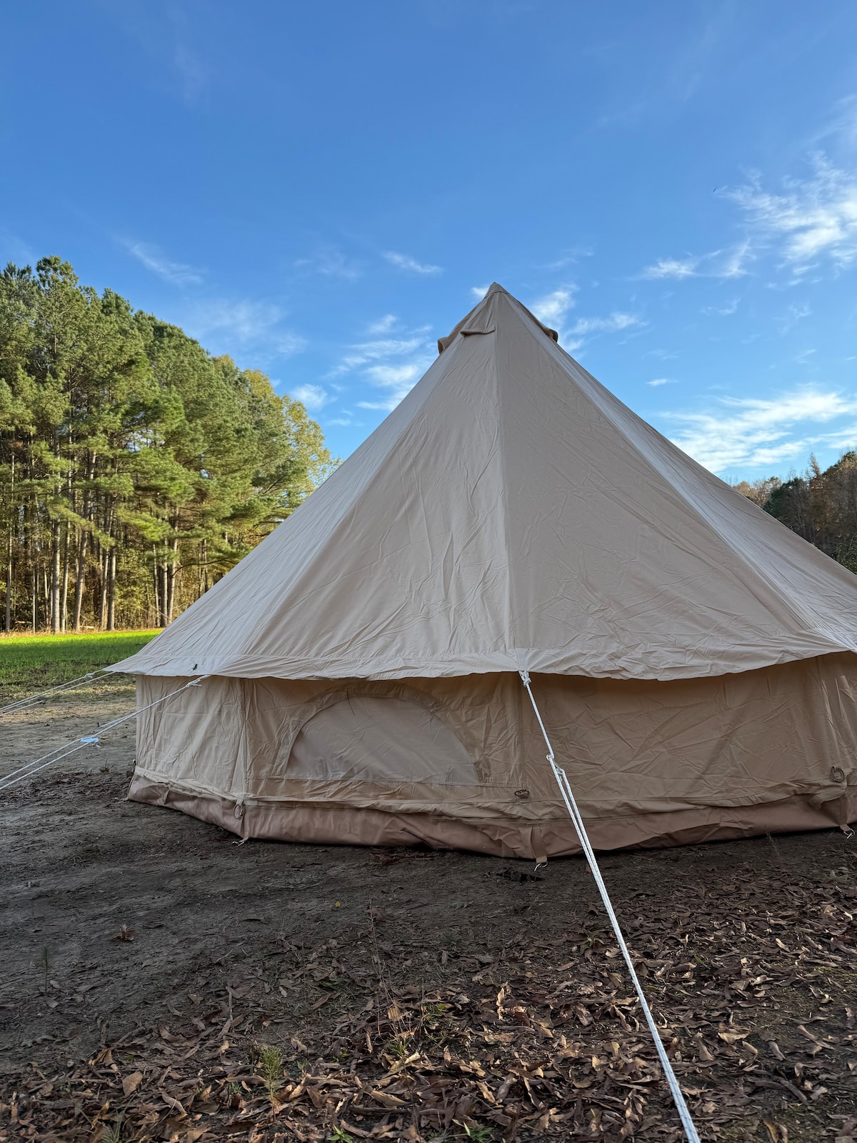 We are offering this very large 12x16 tent with electricity. It is with a queen bed, dining room set, lights, microwave, fridge and mini oven. Bring sleeping bags for extra people. There is a portable AC for evening and sleep time use but probably won't be great during the hot days since this is a tent. The bathroom has unlimited hot water and is a separate building just about 30 ft from the tent. We are only 3 miles from the ocean. No smoking allowed on this property.