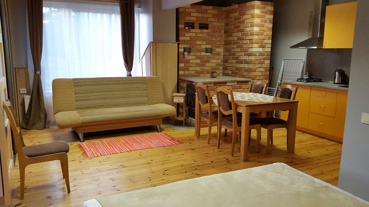 Cozy studio for rent in a lovely village by the sea.A great place for your holiday!Studio has a separate entrance with a hall, inside the studio- double bed and sofa, kitchen, fridge, washing machine and etc. Outside - barbecue place, parking,WIFI. Outside sauna and heated bubble bath (jacuzzi) is available for additional cost.
