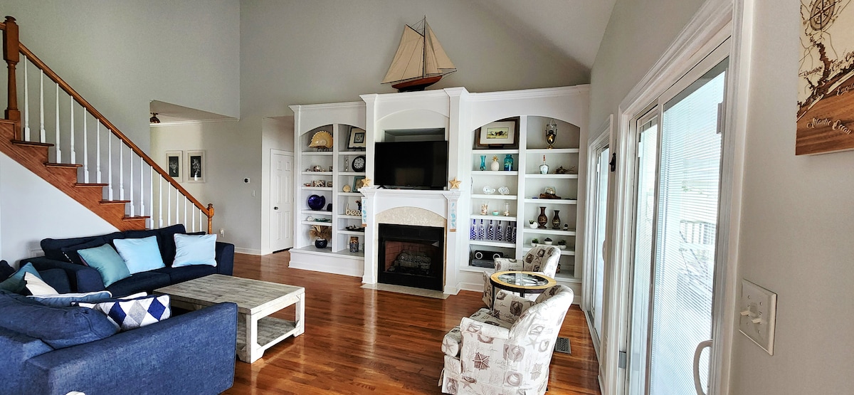 Wake up to gorgeous water views at the Mountains-to-Sea Hideaway; enjoy the huge yard, kayak or fish off your private dock, then hit the beach or town and finally unwind at the firepit under the stars. This waterfront log cabin is designed for family fun or couples looking for a cozy retreat close to everything on the Crystal Coast. Water views, a dock, firepit, arcade room and plenty of outdoor space provide something for everyone on a great family vacation.