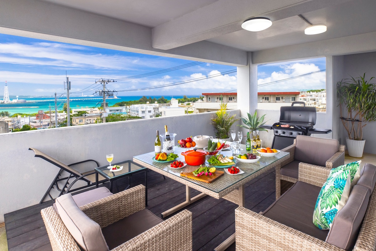 340度オーシャンビューの崖の上に立つ2022年9月新築の一軒家。 約100平米のすべての部屋がオーシャンビュー。お客様の使用可能エリアは2階の宿泊施設と、3階屋上のバーベキューテラスです。 各部屋に50インチ以上のテレビ、リビングには4Kプロジェクターと大型のスクリーンがあり、映画鑑賞も可能です。 外階段からつながる屋上にはバーベキューテラスがあり、サンライズも、日中のオーシャンビューも、夕方のサンライズも、夜の夜景と星空、月も楽しめます。海や自然の景色に癒されます。 屋上テラスにはトイレが完備されており、キッチンスペース、洗い場もございます。コンセントは8つ有り、IHを使った調理なども可能です。 2つある寝室には、ダブルベッドが2つずつ用意されており、最大8名様の宿泊が可能。 リビングにあるソファーにもシングルベッドサイズのスペース有り。 カップルでも、ご夫婦でも、ご家族でも、3世代のご旅行でもお勧めです。 周りはとても静かで、夜は虫の音色、フクロウの声、耳を澄ませば波の音なども聞こえてきます。 車で10分の場所に海中道路などがあり、マリンスポーツの拠点としてもお勧めです。