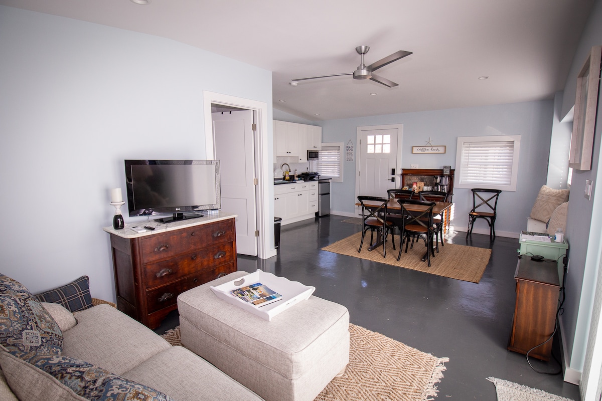 Modern 1BR/1BA retreat near the Lobster House and Cape May Marina. Perfect for two, this chic and spotless home includes linens, towels, beach chairs, and beach tags for an easy stay. Relax in the stylish living space and enjoy nearby dining, beaches, and attractions. Designated parking for one car included. Please note: approximately 12 stairs required for entry.