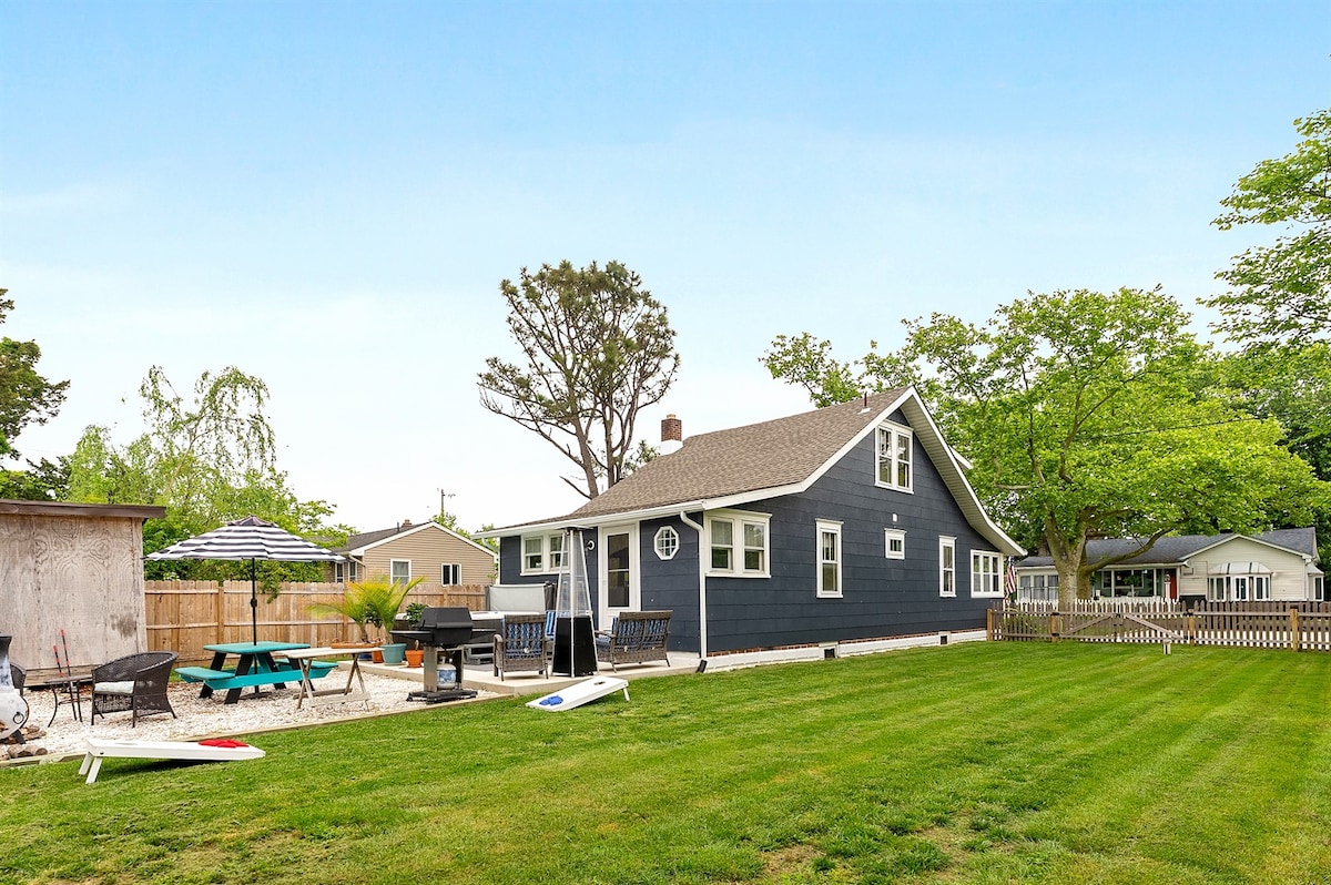 Beautiful 3 bedroom newly renovated beach cottage located on 1.5 acre lot. The spacious house offers space for everyone. The first floor features a spacious living room with an indoor fireplace, a large dining room accommodating up to 8 guests and a lovely kitchen with a bright breakfast space. The screened in porch is perfect for reading or family games. The game room has a ping pong table, foosball table and an arcade game. BBQ on the patio while the family enjoys the lawn games and much more