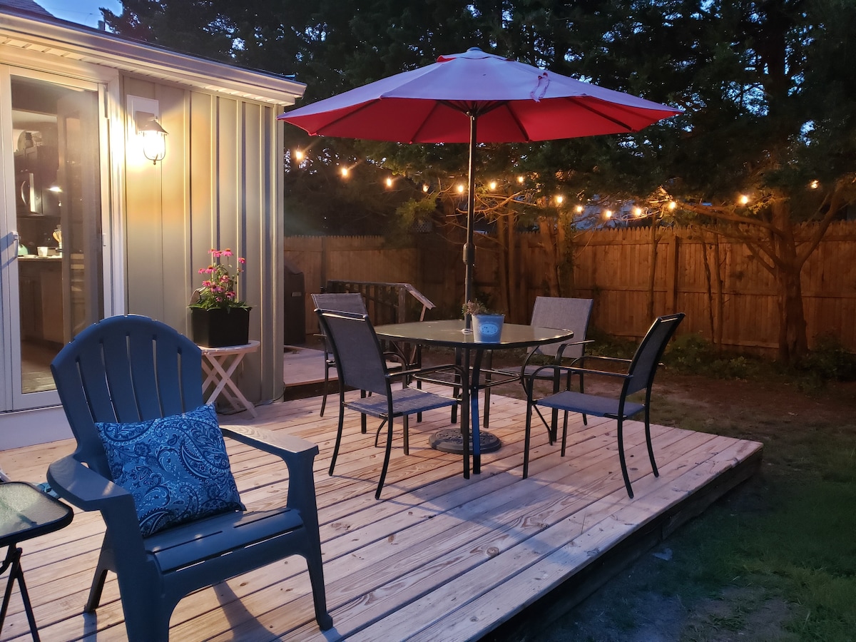 Relax in a spacious, private suite nestled on 1.5 acres in a premier birding area of Cape Island. You are staying in Cape May's original Lifeguard Headquarters, renovated with a new deck, patio, bathroom, and beautiful views of Shunpike Pond. Includes a private deck and patio, BBQ, parking, Queen bed, kitchenette with microwave, fridge, toaster, and coffee bar. The suite does not have a separate bedroom. It is attached to the main house. Beach tags, chairs, and an umbrella are included.