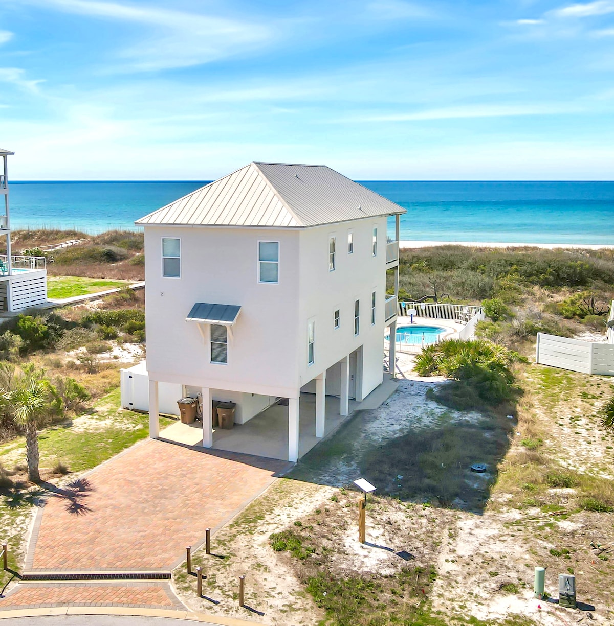 Welcome to EsCape Vibes - a beautiful GULF-FRONT home in Cape San Blas, FL! ★ Panoramic ocean sunsets ★ Secluded, quiet beach ★ Heated, Private pool ★ Views of the gulf waves ★ 3 Kings - each with en suite & deck access ★ Elevator ★ Bunk room (4 Fulls), with en suite bathroom ★ Outdoor shower+bathroom