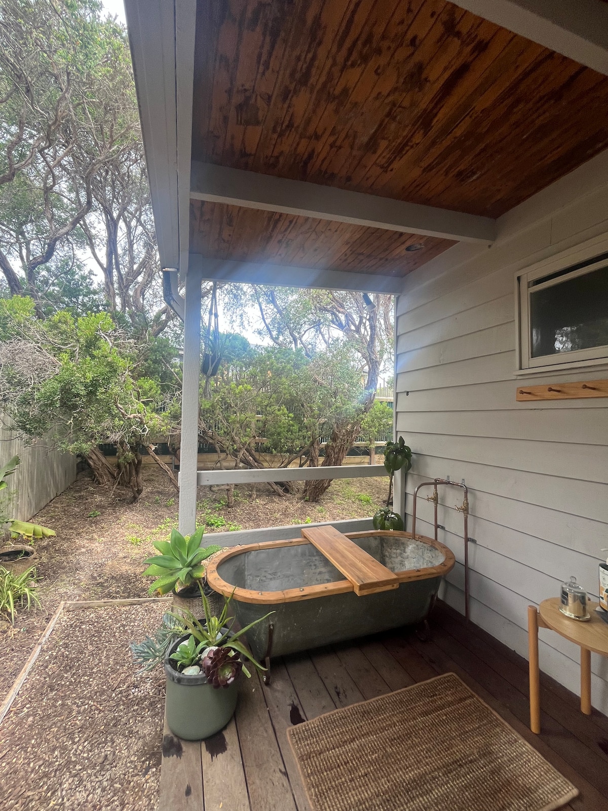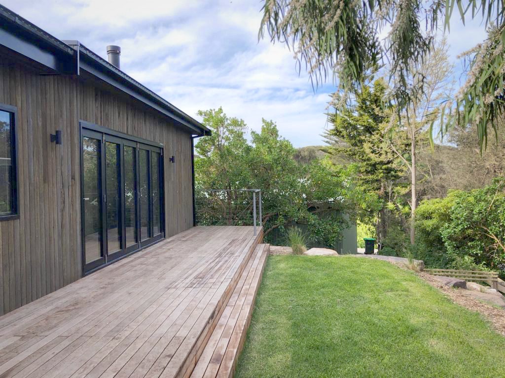 Trentham Cabin is a newly renovated 2 bedroom cabin nestled on a corner block amongst established trees opposite a local reserve park. One bedroom opens out to a private deck/ outdoor spa bath, with the other room opening out to an outdoor shower entertainig area. It has a woodfire that heats up the whole place in winter as well as AC unit/ceiling fans for summer days. The kitchen/lounge floor plan opens out to huge deck via bifold doors. Located 15mins walk from front and back beach.