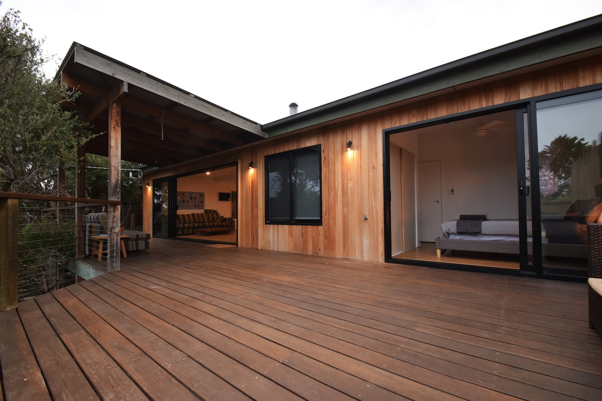 Bring your lovers, family, friends, pets and toys to experience all the Peninsula has to offer while staying in our architecturally designed Eco Retreat. Our huge outdoor entertaining area/kitchen has a long table for leisurely lunches, bbq, fire pit and hammock hangs. The house is open and bright, with plenty of couches and beds, a pool table, dress up box, disco ball, eclectic art, books, games, herb garden, hot outdoor shower and a composting toilet! Come and play…