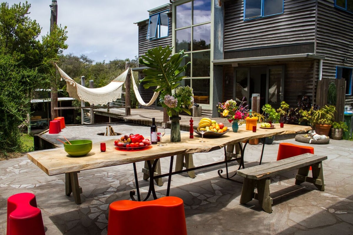Bring your lovers, family, friends, pets and toys to experience all the Peninsula has to offer while staying in our architecturally designed Eco Retreat. Our huge outdoor entertaining area/kitchen has a long table for leisurely lunches, bbq, fire pit and hammock hangs. The house is open and bright, with plenty of couches and beds, a pool table, dress up box, disco ball, eclectic art, books, games, herb garden, hot outdoor shower and a composting toilet! Come and play…