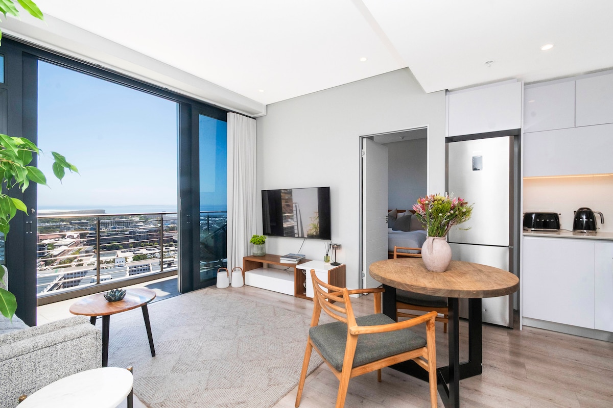 Welcome to the greatest views imaginable from a stylish, brand new & tastefully decorated apartment high up in the Cape Town sky. Enjoy the 'sunsational' pool deck and outdoor gym on the 27th floor or simply step out onto your very own large wrap around balcony for breakfast while enjoying the finest views of Table Mountain, The sparkling azure of the Atlantic Ocean or the Robben Island & The Cape Town Stadium. *Zero power cuts in this builidng.