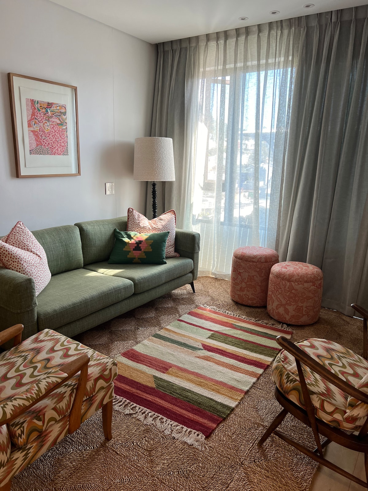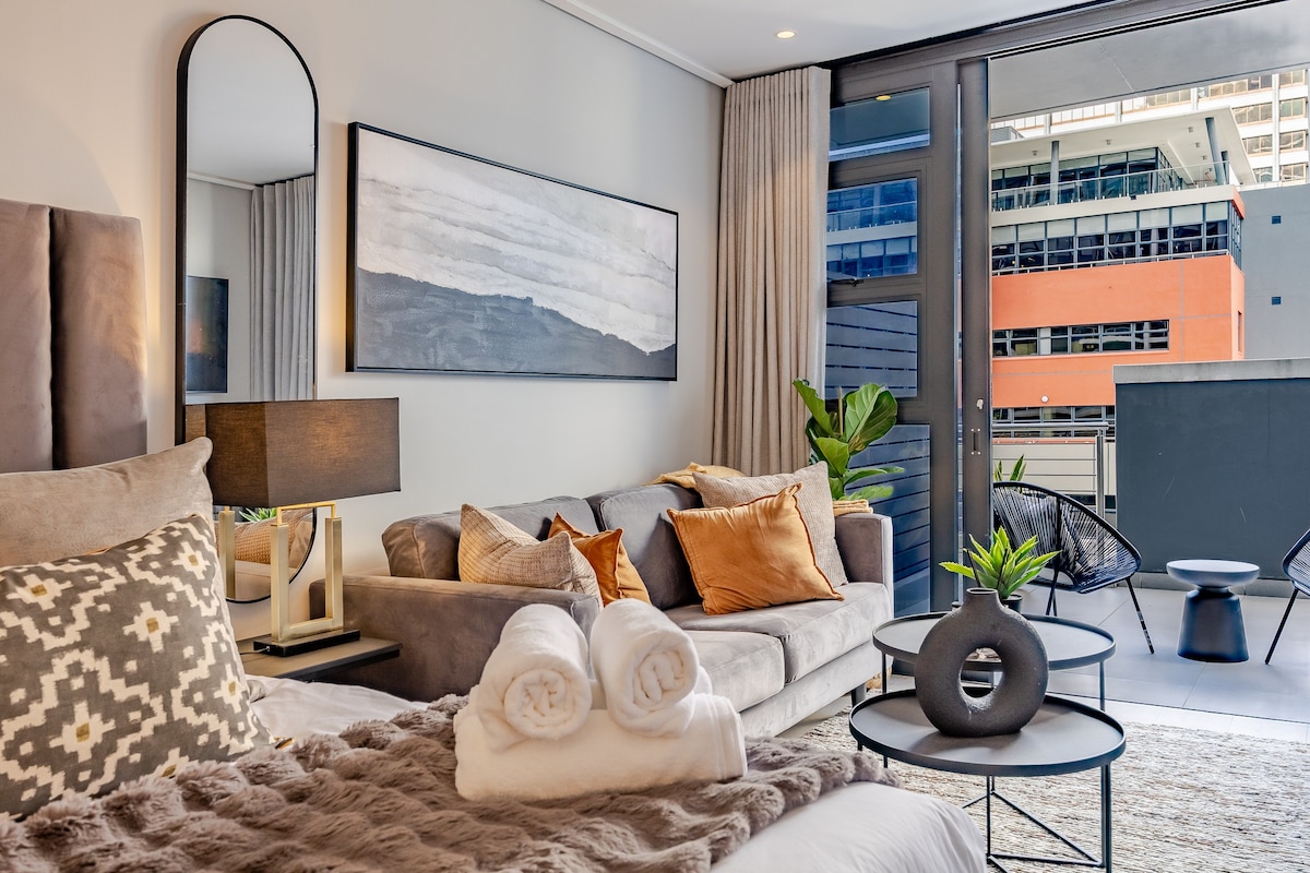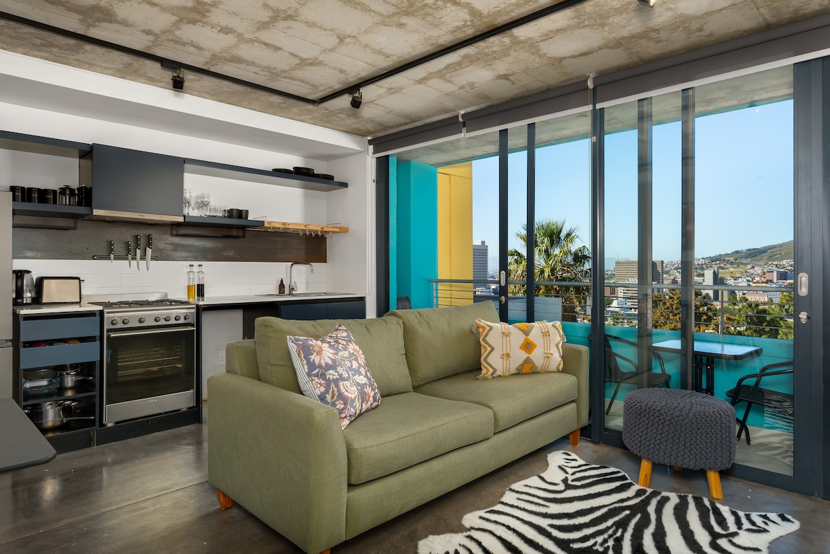 Welcome to The Sanctuary (Table mountain views) Colourful birds and deep emeralds immersive you upon entering this lush space. Fitted with the best linen and finishings to take your breath away. A fully equipped kitchenette is at your disposal. The lounge is perfect for those comfortable movie nights. In this space you will find a multi-purpose dining/work station below the 50” TV (fast and secure wifi) with a balcony overlooking Table Mountain.
