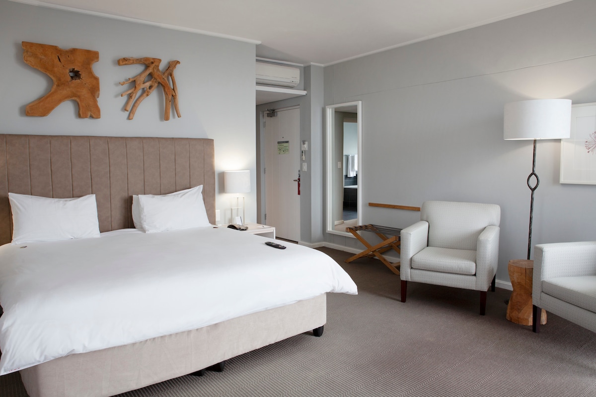 This warm and stylish room at STOEP Boutique Hotel in Kalk Bay is a serene coastal retreat. Featuring a queen-sized bed with textured pillows, a cozy reading nook bathed in natural light, and earthy wooden finishes, the space effortlessly blends comfort with contemporary design. Woven accents, modern art, and lush indoor greenery create a calm, welcoming atmosphere—perfect for relaxing after a day of exploring the charming seaside village of Kalk Bay.