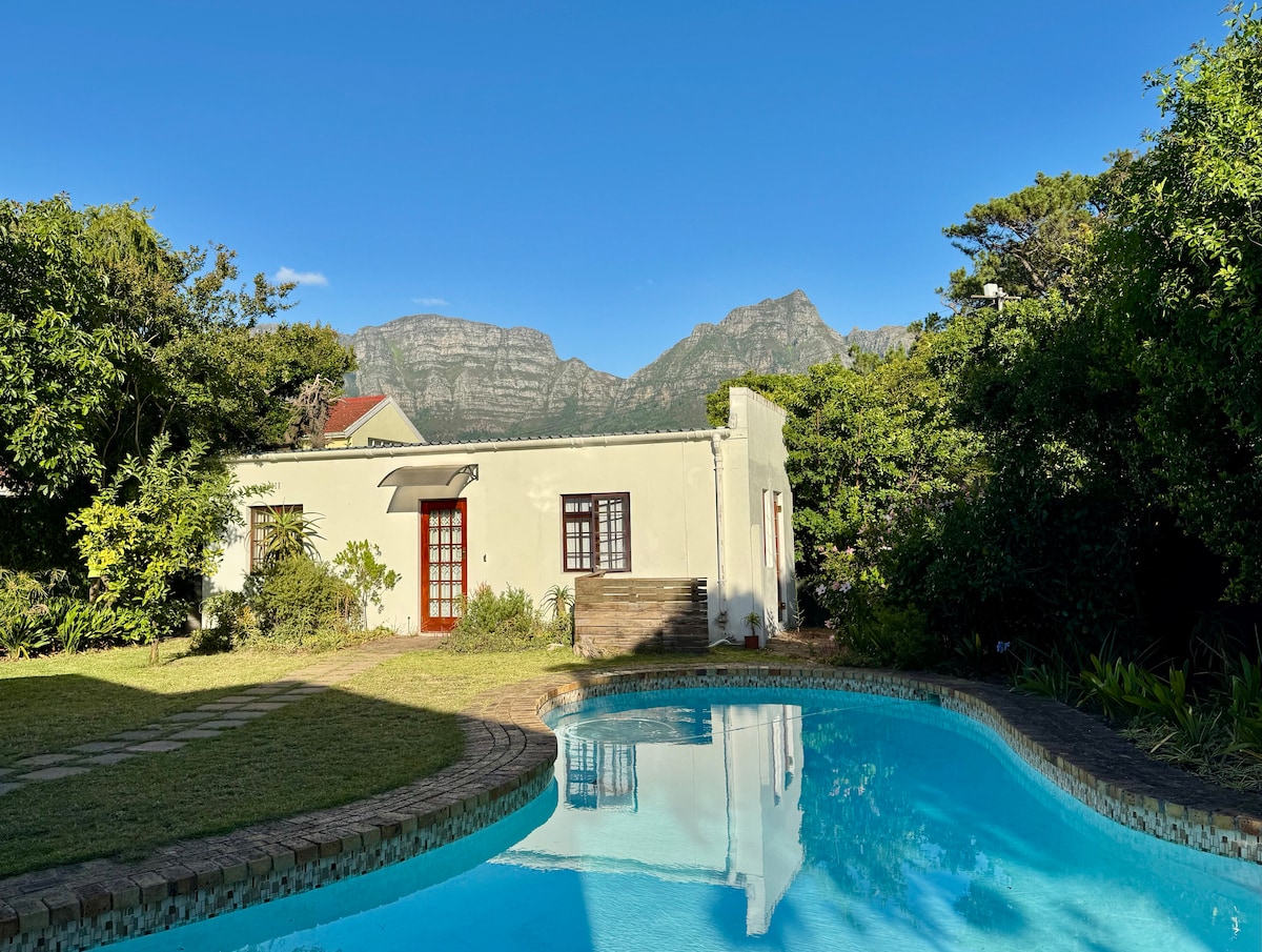 Peaceful and secure self-catering cottage with separate garden flat offering fully equipped family accommodation in a leafy suburb of Newlands adjacent to Keurboom Park. There are views of the mountain from the terrace, secure parking and a private walled garden with swimming pool. The main house sleep 4-5 (double, twin and single bedrooms) and the garden flat sleep 2-4 (double bedroom and sofa-bed in living room). For off season longer winter lets - do contact us for availability.