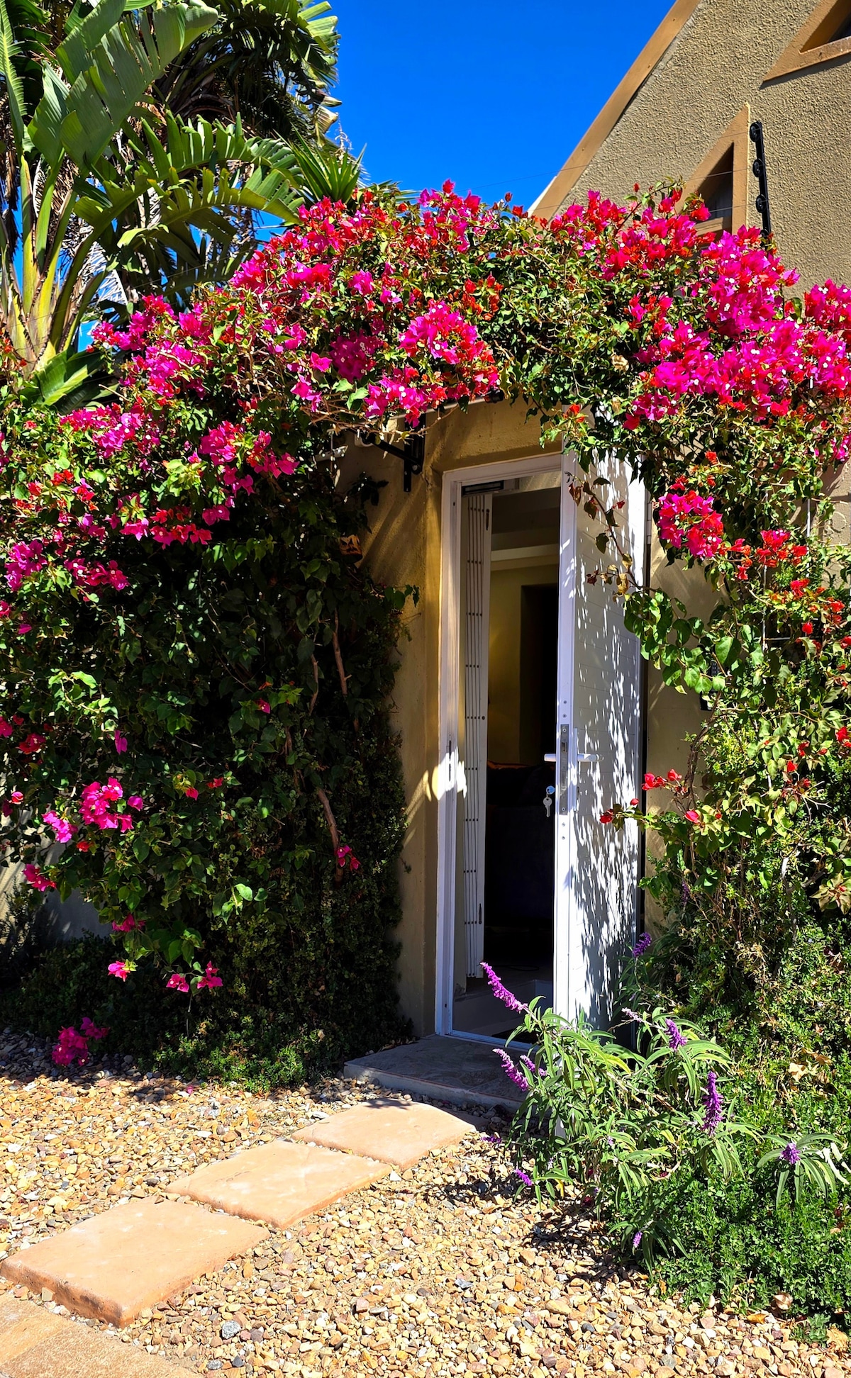Unwind at this stunning French Provencal beachside cottage. The house was lovingly built with stone floors, high-beamed ceilings, and antique details for a luxurious yet charming feel. Enjoy the sea and mountain views from the pool, lush garden and private patio leading off the living area Beautiful French Provencal stone cottage set in private indigenous garden overlooking Llandudno beach. The cottage was lovingly built with exceptional attention to detail, including stone floors, high beamed ceilings, antique light fittings, French wrought iron work and wooden shutters. It comprises a double bedroom with French doors leading onto private gravel patio with sea and mountain views and breakfast table shade by tall proteas, bathroom with bath and shower tiled in travertine (also mountain views!), lounge with kitchenette and covered "sundowner" patio with magnificent sea views. The lounge and kitchenette are fully equipped with TV, fridge, convection microwave, hot plates, washing machine, dishwasher, kettle toaster, coffee machine etc. There is a stone table and chairs on patio where you can sip your cocktails at sunset as well as loungers to soak up the afternoon sun while overlooking the ocean. The beautifully furnished bedroom comprises a queen-sized bed with down duvet, French antique linen and cotton quilt. Fluffy white bath towels as well as beach towels and umbrella are provided. The Victorian roll-top bath has wonderful mountain and garden views through sash windows The cottage is surrounded by a beautiful garden planted with indigenous plants as well as an assortment of cooking herbs, which you are encouraged to use. Guests are welcome to make use of the large swimming pool and pool loungers located next to the cottage. We also have access to squash and tennis courts as well as a yoga school located 300m from the cottage. The beach is ± - 5min walk away. There is under-floor heating throughout and a gas fire place in the lounge for cosy winter evenings Guests have access to lbeautiful landscaped garden and arge swimming pool. Cottage is a 4min walk down to the beach Owner lives on the property in a separate private residence and is always available for advice on dining, site seeing etc Situated in the spectacular enclave of Llandudno which is on the Altantic coast between Camps Bay and Hout Bay. Llandudno beach with its fine white sand and curling surfing waves is one of the finest in Cape Town, but due to the limited parking is kept unspoilt and for used mainly by locals. Shops and restaurants are a 5min drive away and Table MOuntain 10min, V&A; Waterfront 25min, Constantia Winelands 20min and Cape POint 35min.The sunsets over the Altantic Ocean viewed from the cottage patio are spectacular. LLandudno is on the MY Citi bus route to town centre Camps Bay, Hout Bay and V&A A Waterfront Cottage is serviced daily from Mon to Fri Check in is from 3pm- 6pm unless prior arrangements have been made Check out is at 11am unless prior arrangements have been made Guests have access to beautiful landscaped garden and large swimming pool. Cottage is a 4min walk down to the beach. There is also access to tennis courts situated 4 min walk from cottage. The house is located in the enclave of Llandudno Beach, a locals-only spot with unspoilt, fine white sand and curling surfing waves. Although shops and restaurants are only a five-minute drive away, the area feels peaceful and secluded. Cottage is serviced daily from Mon to Fri Check in is from 3pm- 6pm unless prior arrangements have been made Check out is at 11am unless prior arrangements have been made Min stay varies from 2 nights to 14 nights depending on season