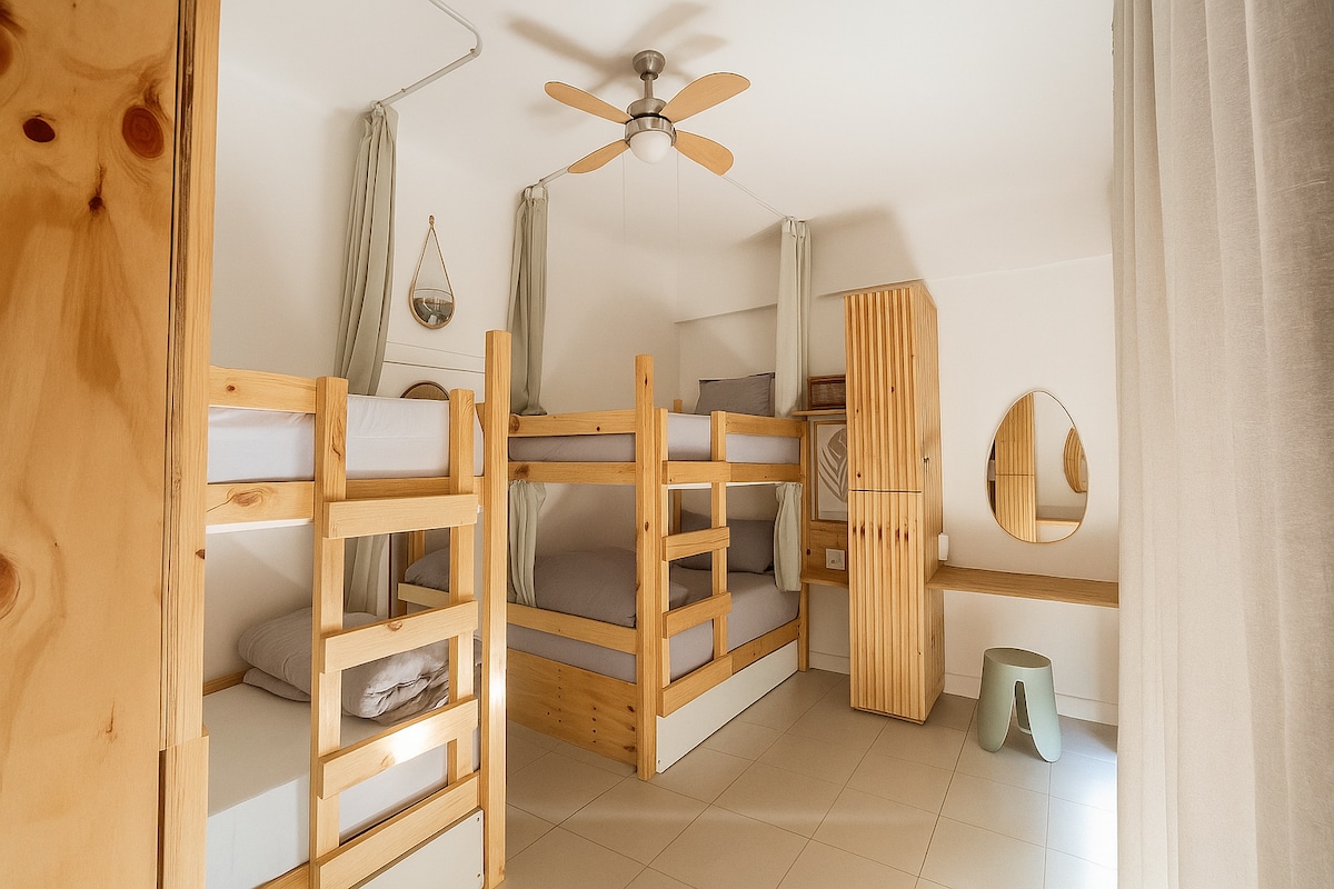 Create lasting memories with your besties or forge new friendships in our vibrant Girls Dorm Rooms. These cozy havens, designed just for you, offer ultimate comfort with high-quality linens and our super comfy custom beds. Included in the room you will find a Comfortable Desk, Mirror, Cupboards and Drawers for Storage, Privacy Bunk bed curtains and a Large Balcony consisting of a dining table and a sun lounger with amazing mountain views.